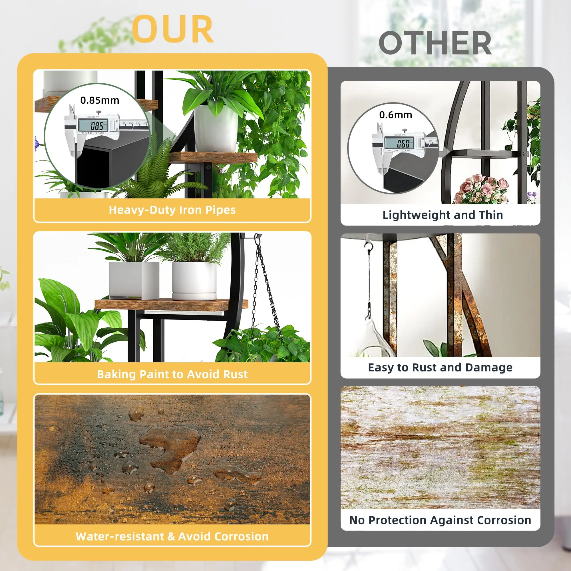 ·【Stable and Sturdy】 The frame of this metal plant stand is made of heavy-duty iron pipe that is 0.85mm thick, so it is firm in structure and has a strong bearing capacity. The surface of the iron pipe is coated with special baking paint to avoid rust. Thickened boards (15mm thick) are constructed of high-quality particleboard and coated with waterproof layer to avoid corrosion, warping and curling.