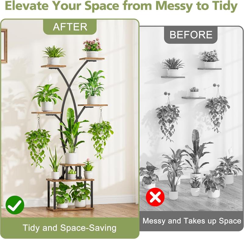 ·[7-Tiered、66" Tree-Shaped Plant Stand]: Our 66" plant stand indoor boasts 7 tiers, 10 pot stands and 2 hooks for hanging plants, capable of showingcase at least 12 pots of greenery. Its distinctive ladder design optimizes space, turning each plant into a living artwork, and immersing you in a lush green oasis.