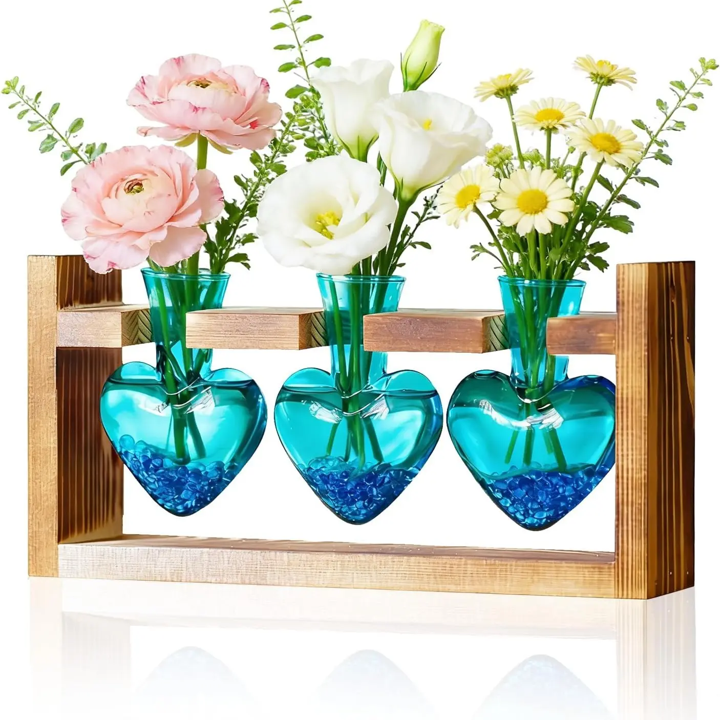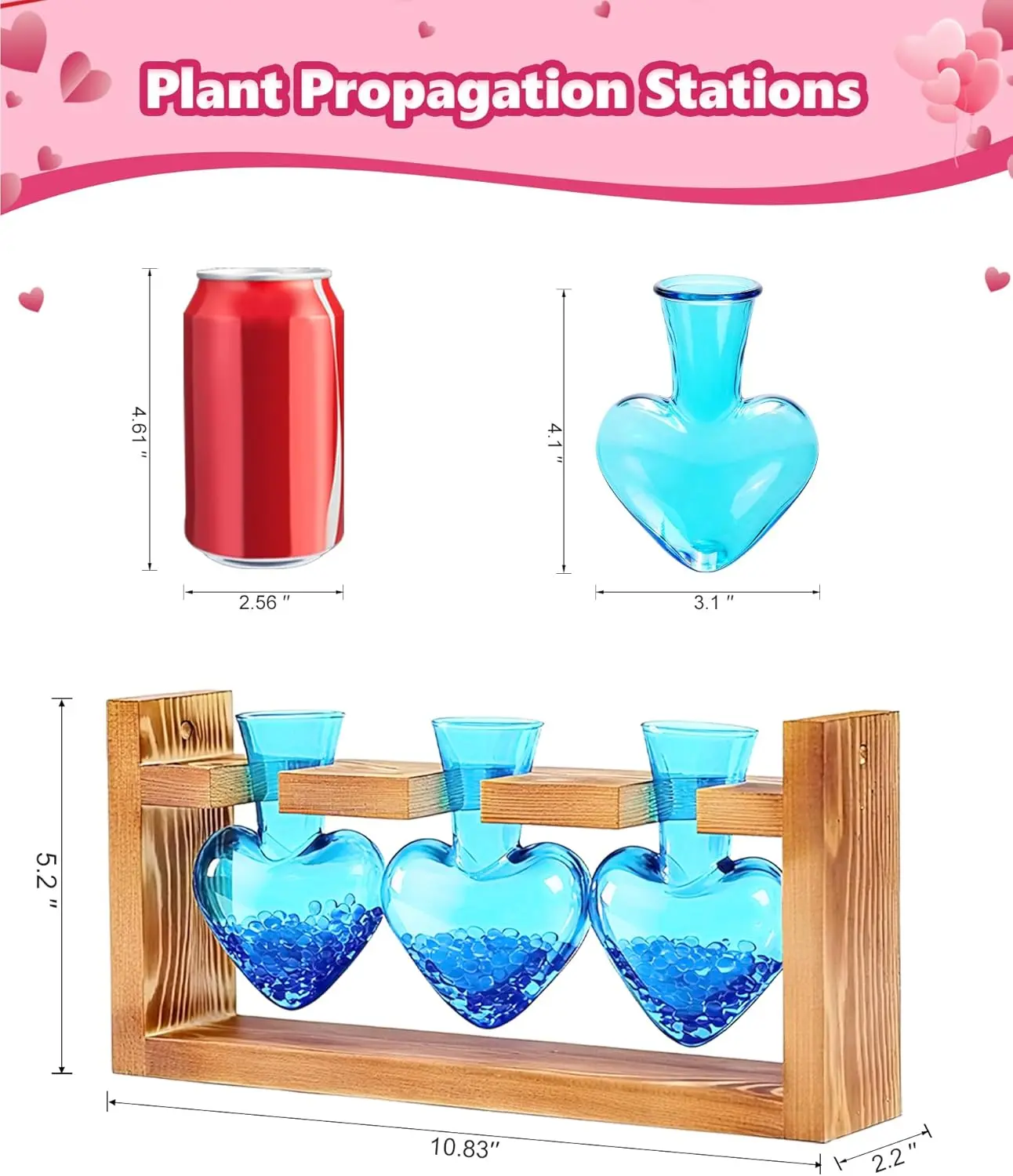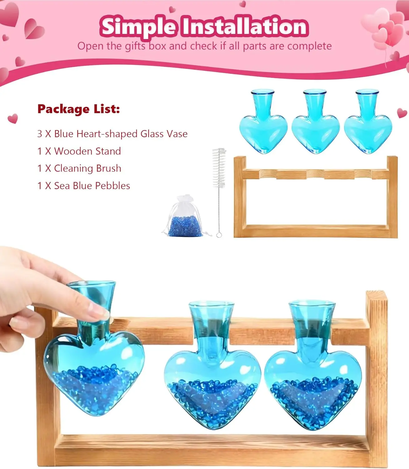 ·Thoughtful Accessories: No tools needed,super easy to assemble in 5 seconds! Just place the glass vases on the wooden stand,the U-shaped design holds them securely, sparing you the stress of time-consuming setup. Comes with a cleaning brush, making vase cleaning effortless and cutting time by 70%. The clear design lets you softly watch roots grow, blending beauty with calm. Adorned with blue glass stones, it adds a warm romantic glow while fixing stems steadily, letting you soak in the healing joy of planting. Enjoy a green, healthy life