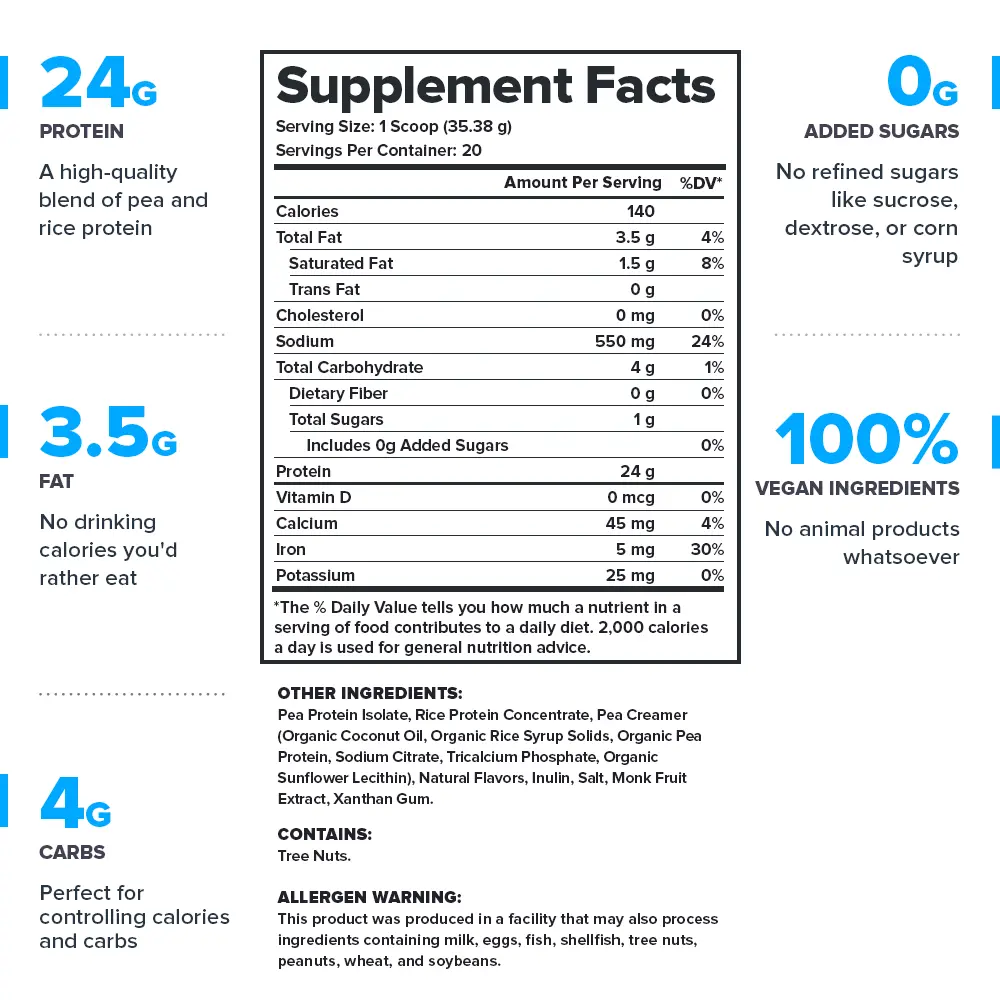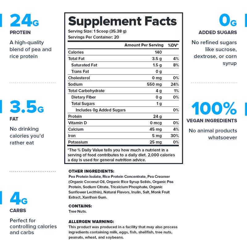 ·Protein Type: Pea Protein Isolate, Brown Rice ProteinProtein Content: 35.38g per servingSource: Sourced from plants, with no animal-derived ingredientsServings: 20 servings per containerCalories per Serving: 140 kcal per servingForm: PowderFlavors: Mocha Cappuccino