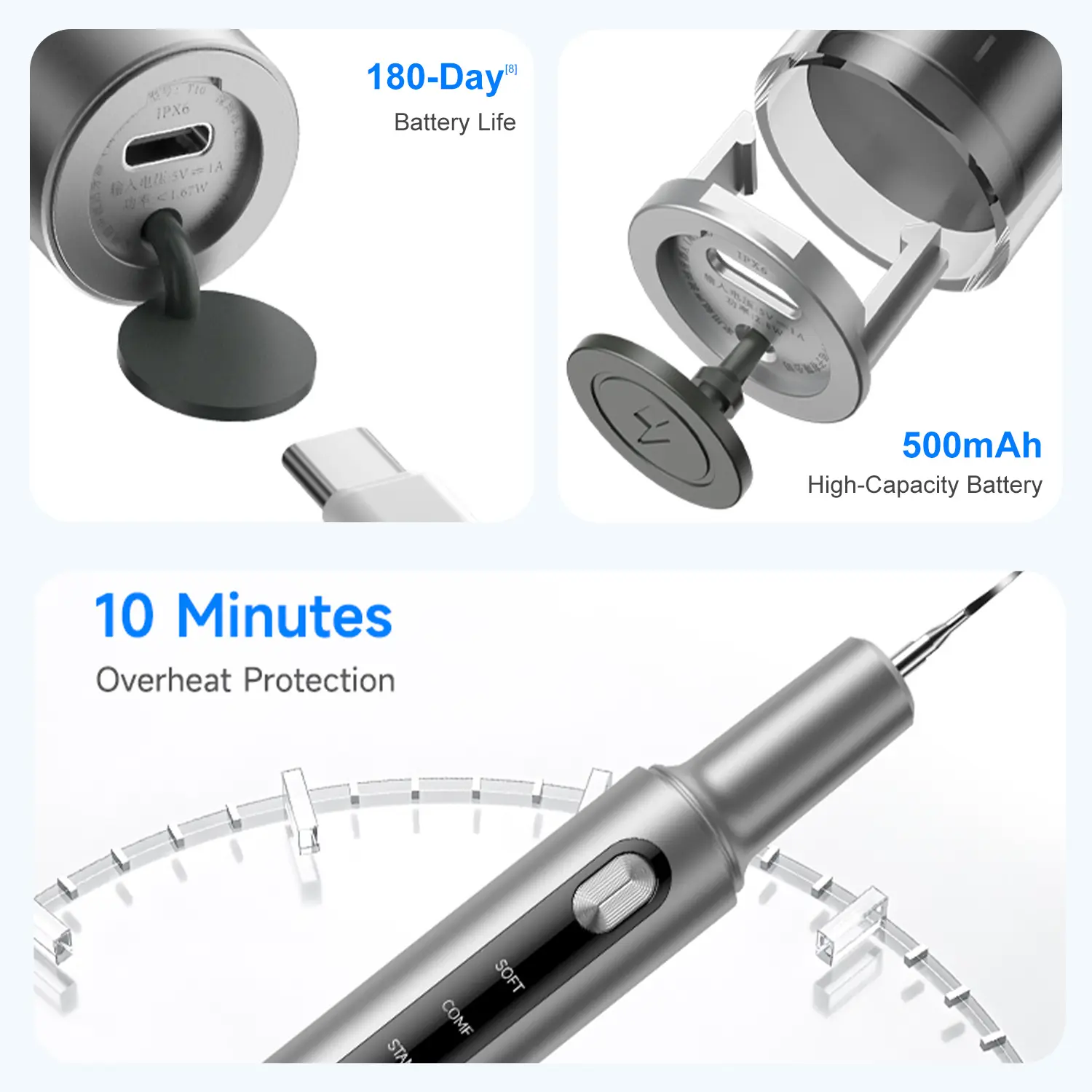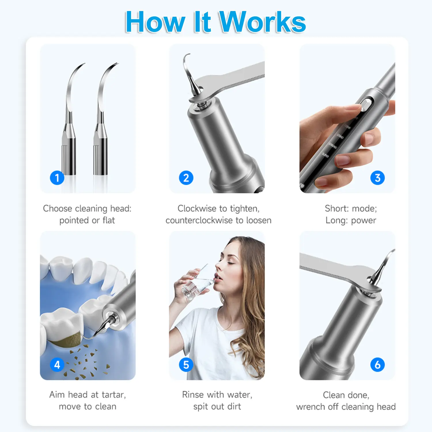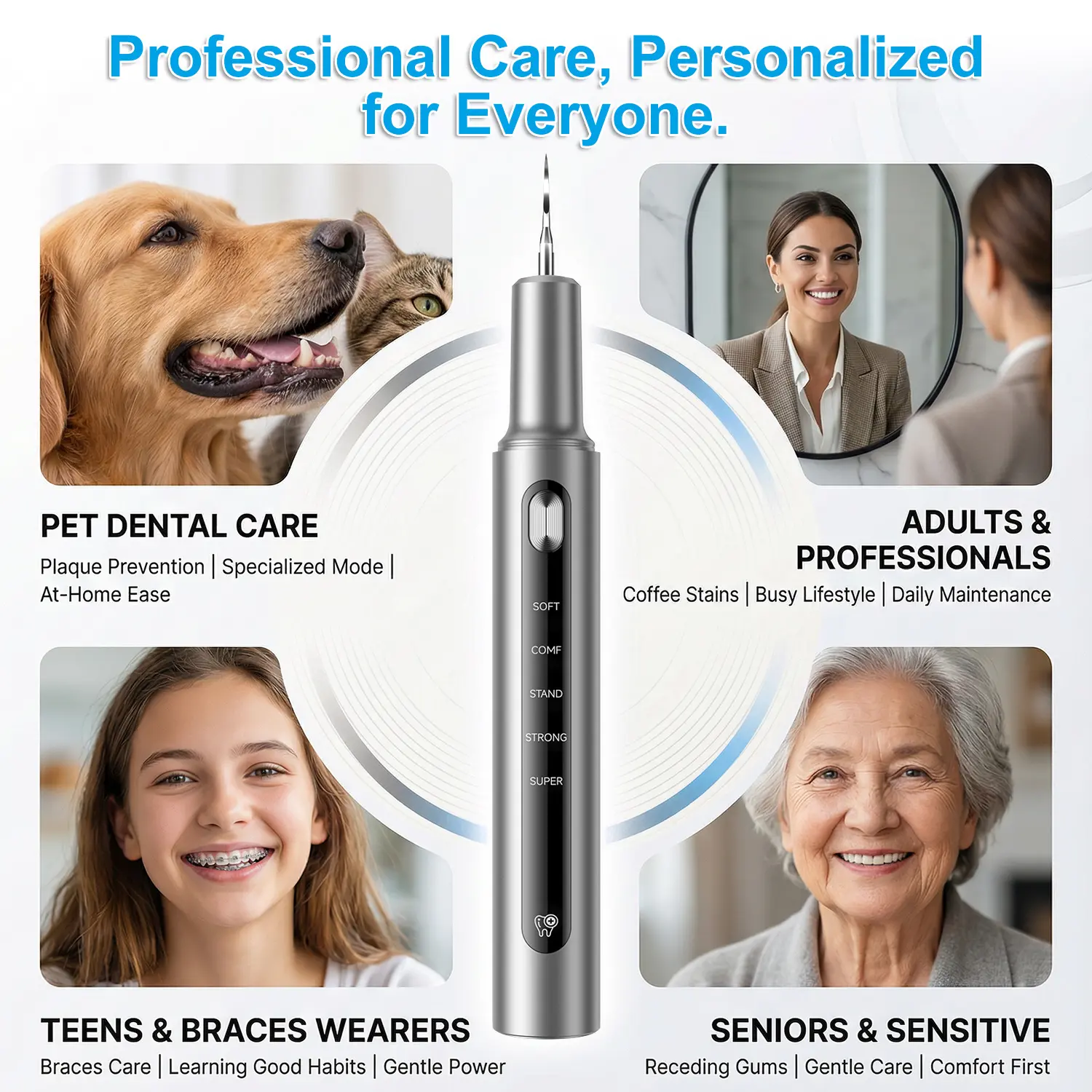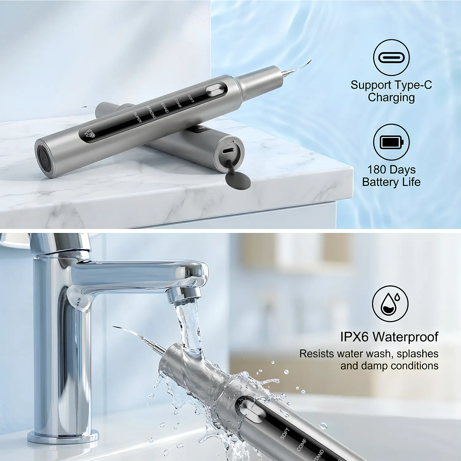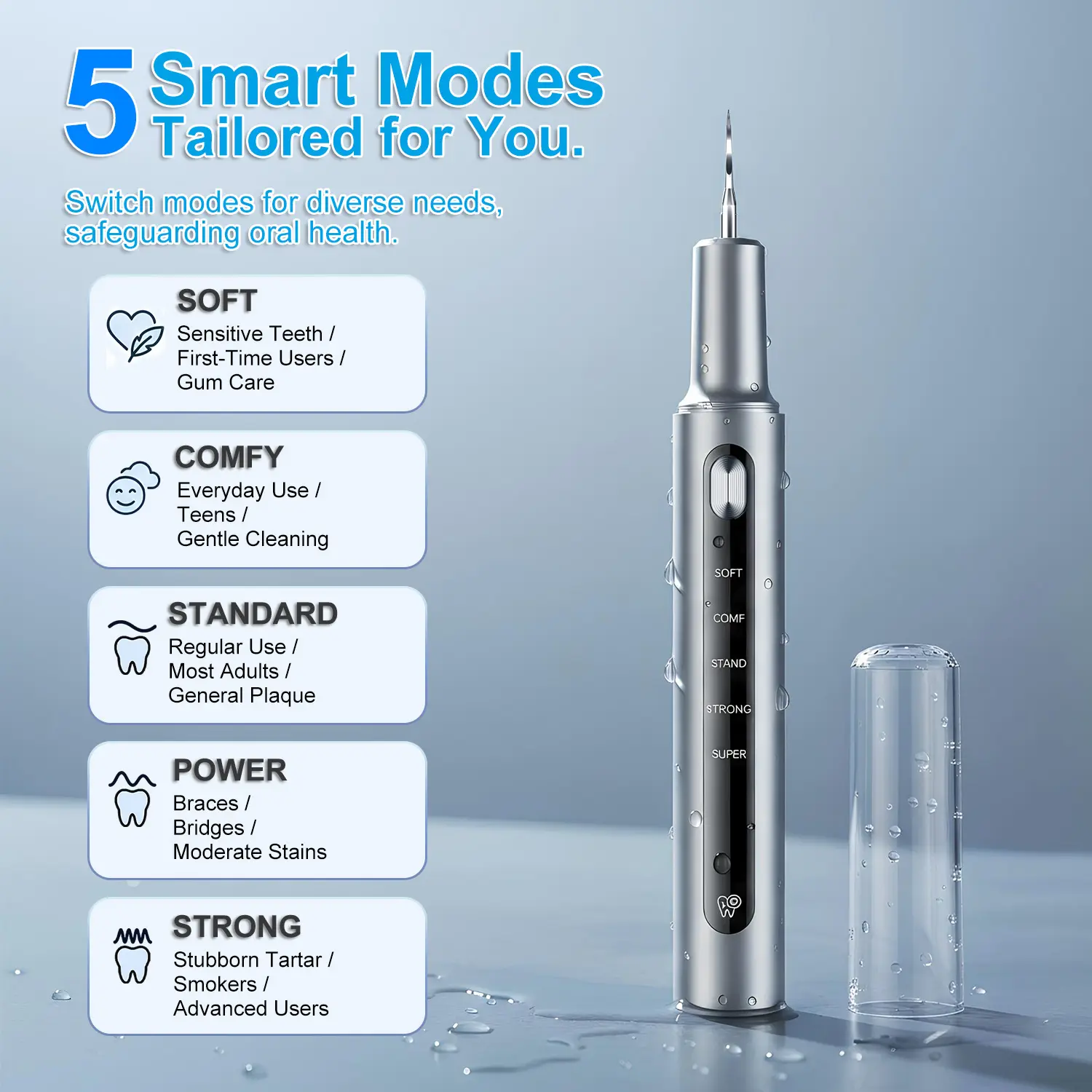 [5 Modes]: The cleaner has 5 modes: SOFT, COMF, STAND, STRONG, and SUPER, allowing you to choose the appropriate mode based on your actual dental condition and sensitivity.