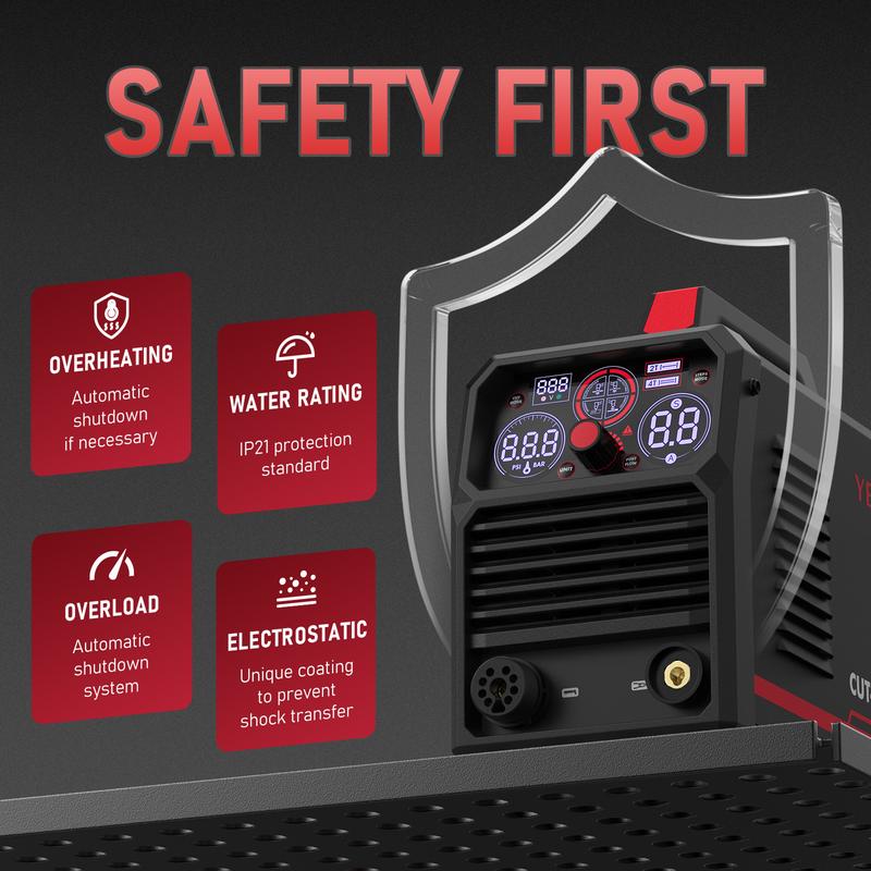 ·Error Codes & Alerts: Overcurrent (E-1), Electrode Short (E-2), Overheat (E-3), No-Load Output (E-4), Low Air Pressure (E-5), Temp Sensor (E-6), Electrode Not Connected (E-7), Over/Under Voltage (yellow).