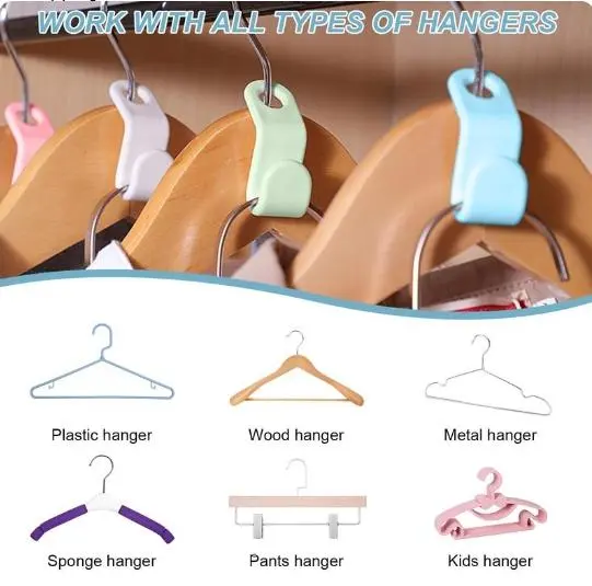 【What you get】40 PCS hanger connector hooks in 4 blend different colors to meet your daily needs(gray, pink, green, blue).The clothes storage hooks vertically connect one hanger to another, making it easy to organize and match your clothes. Save at least 3 times the space in your wardrobe.