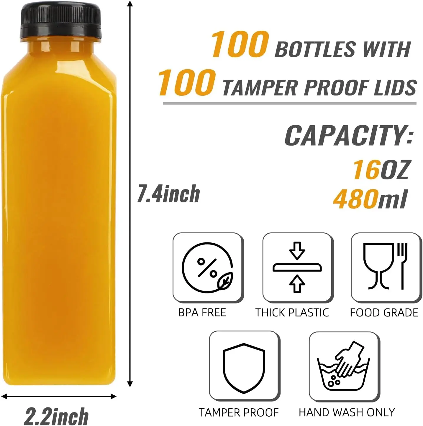 ·SUPER-VALUE SET: Contains 128 pcs 16oz plastic juice bottles with black tamper-proof caps. Bottom diameter x height: 2.2 inches x 7.5 inches, with cleaning brush and funnel, easy to use. The plastic juice bottle with classic shape meets your diverse needs.Attention: the colors of brushes and funnels are random.