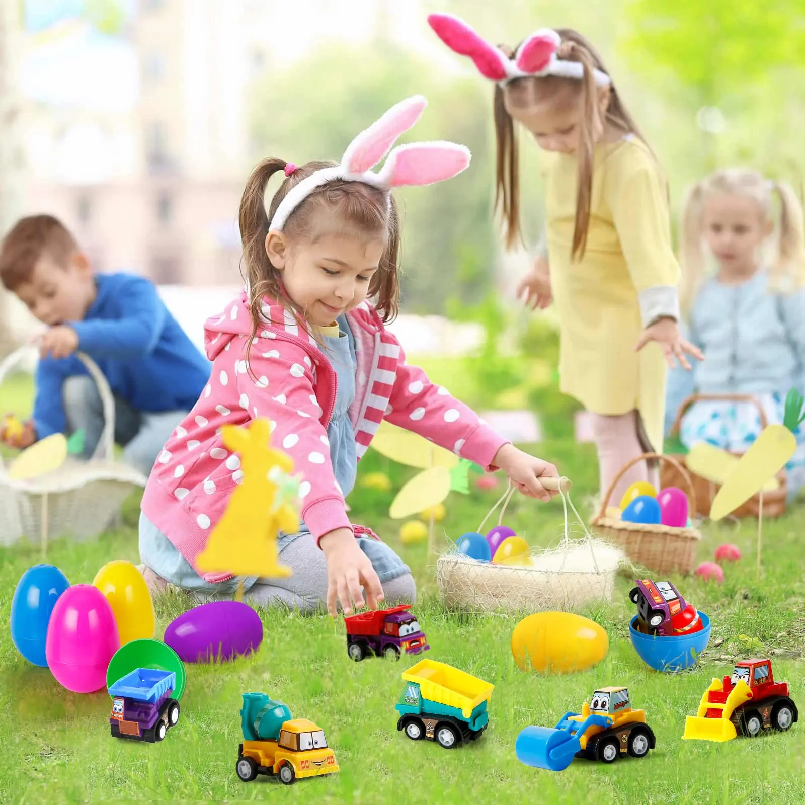 ·[Set Includes]: 1 dozen (12) medium Easter eggs, prefilled with 12 different pull-back construction vehicles with movable parts. Top and bottom parts of eggs snap together to hide surprise vehicle inside. Kids will be delighted to discover the surprise in each Easter egg they hunt!