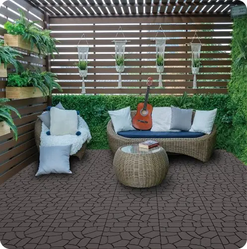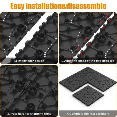 ·These deck flooring tiles have an interlocking design base for easy do-it-yourself installation and no tools required for installation.No messy glue, no nails, perfect match and precision spacing between every tile.