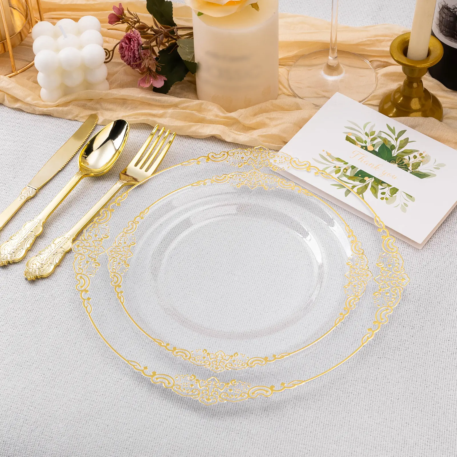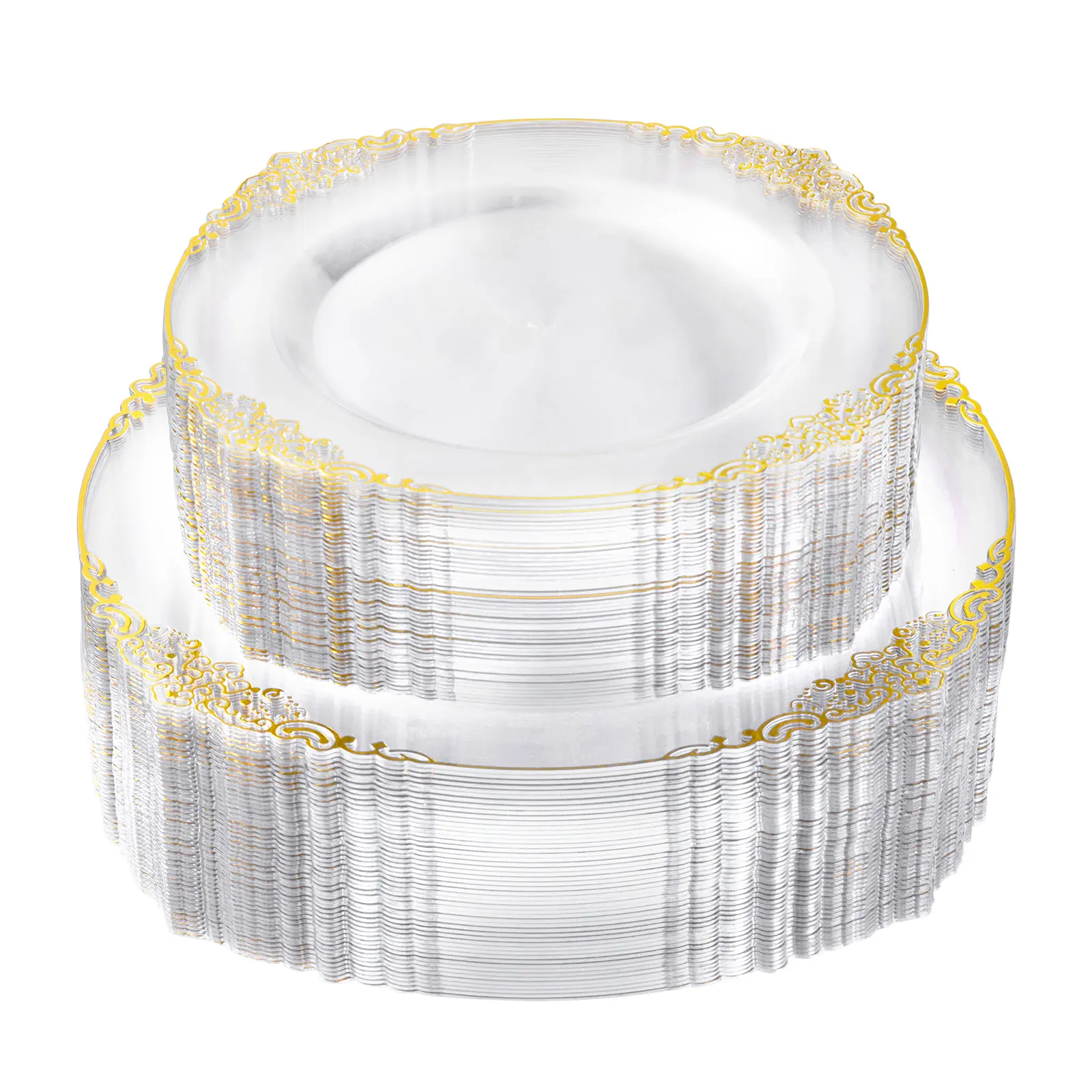 This set of clear gold plastic plates is crafted to enhance the aesthetic of your event and provide a seamless dining experience.