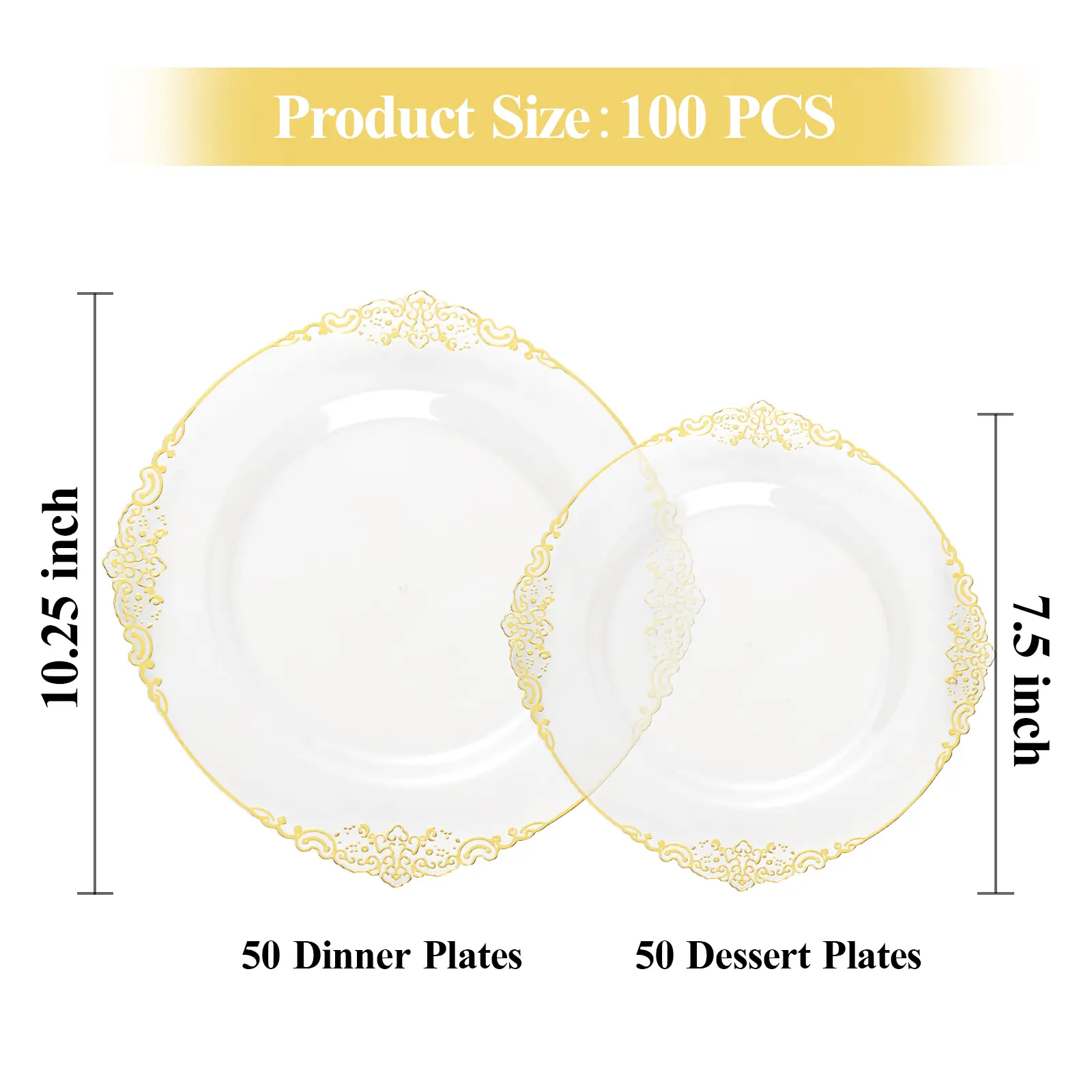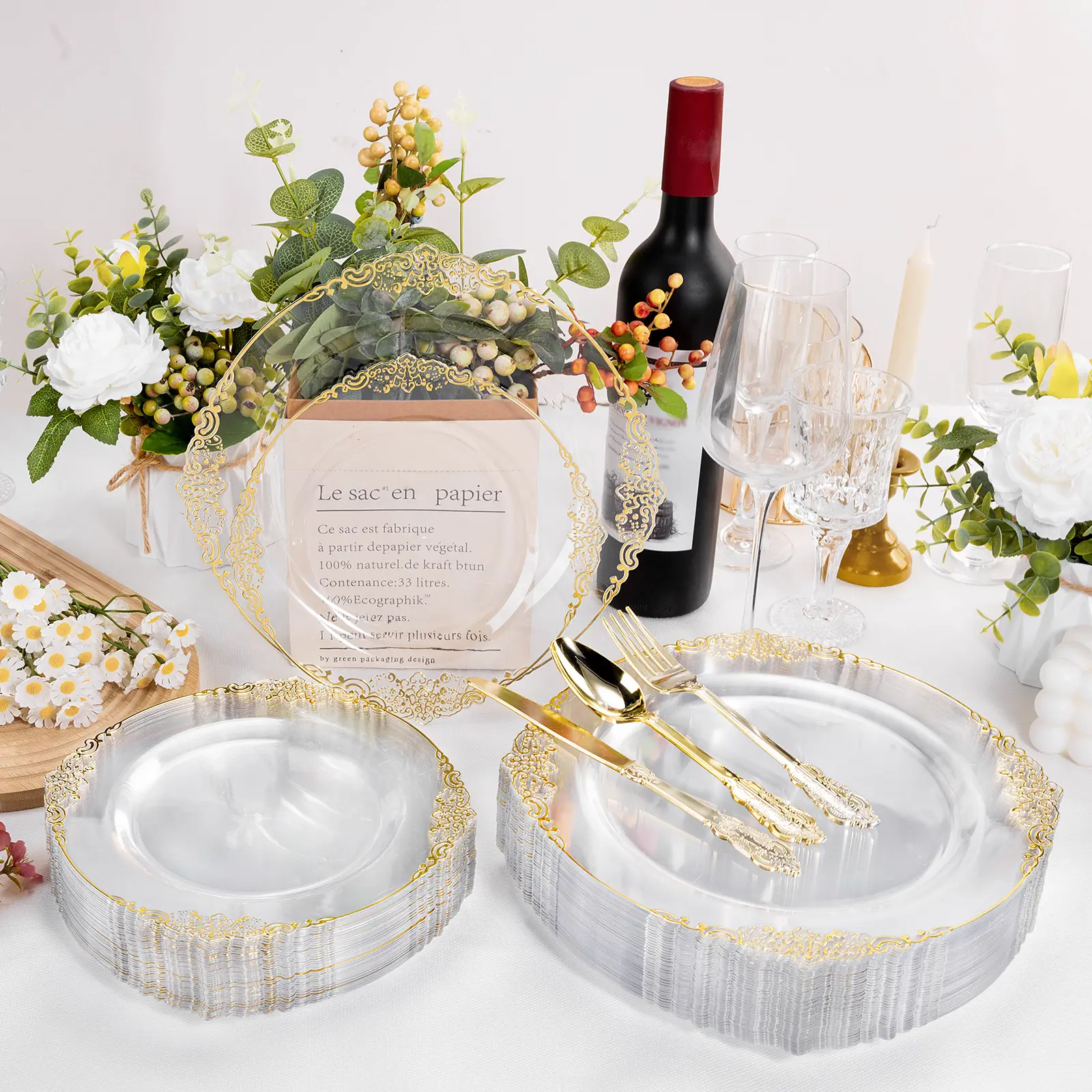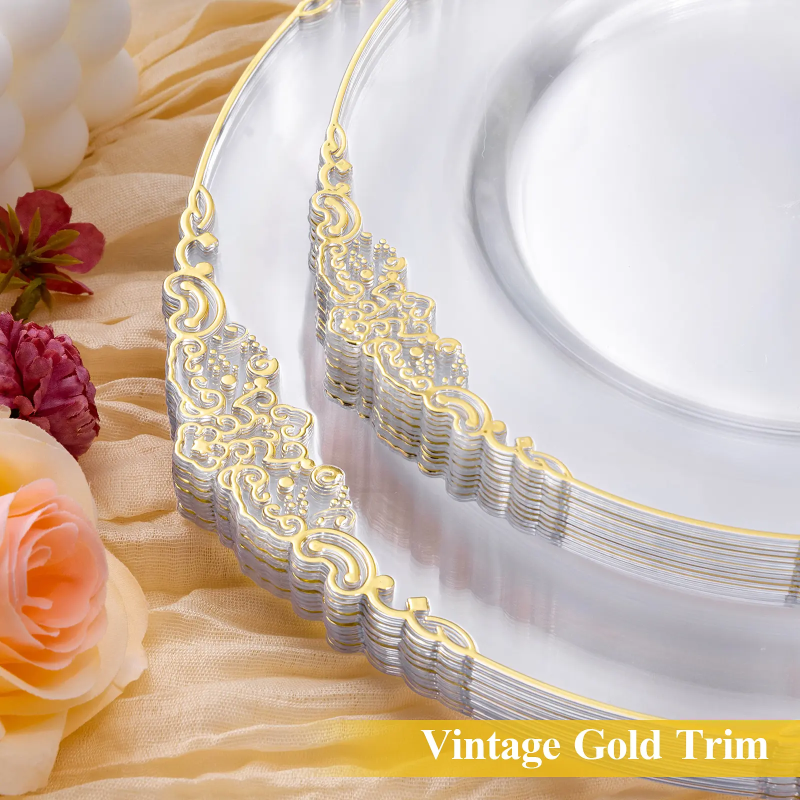 These plastic plates feature a sophisticated vintage gold trim, adding a touch of luxury to your event. Perfect for elevating the ambiance, our high-end disposable plates bring a unique flair to any gathering.