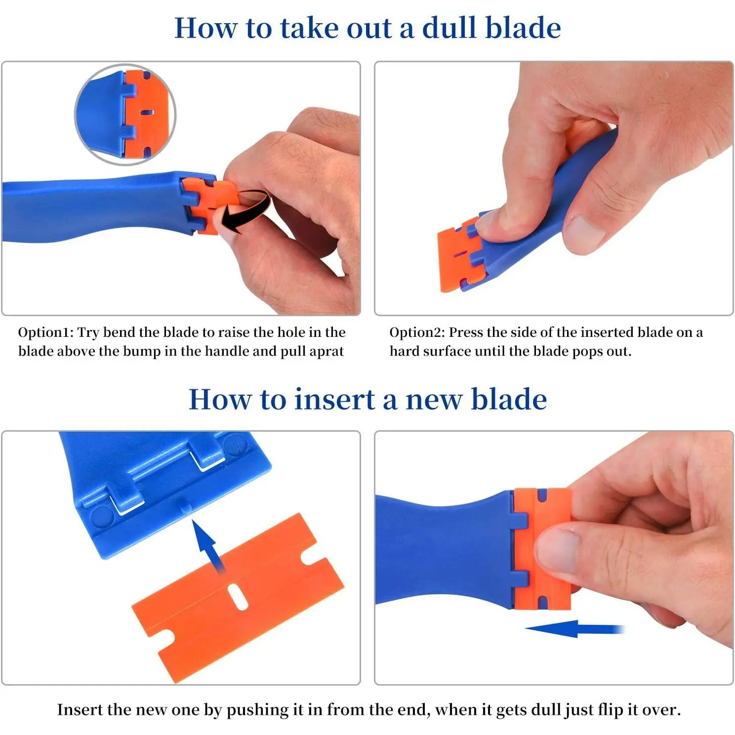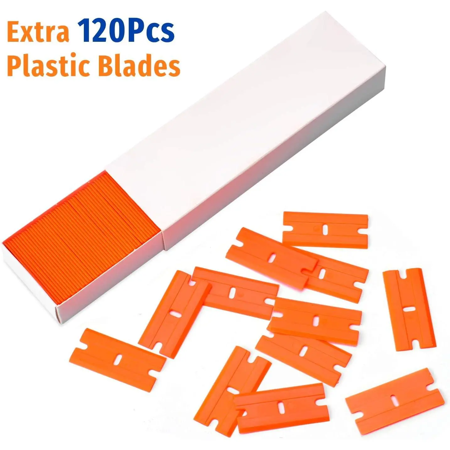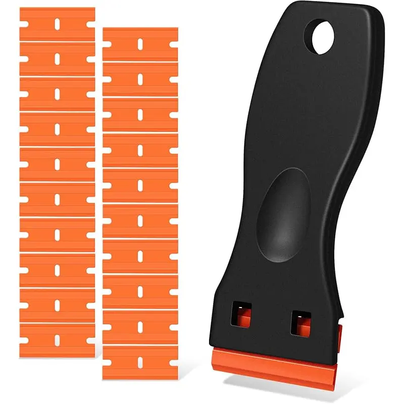 [SCRATCH PROOF]This windshield sticker remover was made from high-quality hot injection molded plastic that can do the same job as metal scraper but also can keep you from getting hurt and scratching[COMFORTABLE DESIGN] This rubber scraper is equipped with ergonomic curved handle that allows you complete the work with a minimum amount of effort. Dent on the handle is especially designed for your thumb placing on it when work, giving you control and comfort[REPLACEMENT BLADES]The pack of two-pack plastic scraper comes with 120 extra plastic blades that well packaged in a small case, enough for your spare and replacement[POCKET-SIZED] This mini widget razor is lightweight and pocket-size item that is 3. 93inches in length, 1. 49 inches in width and 0. 87ounces in weight, very easy to carry and storage[WIDE APPLICATION] This razor scraper tool is ideal for removing vinyl, debris, decals, sign, glue, stickers, labels, grease and paint from glass, walls, appliance, metal or cooktop, oven and more