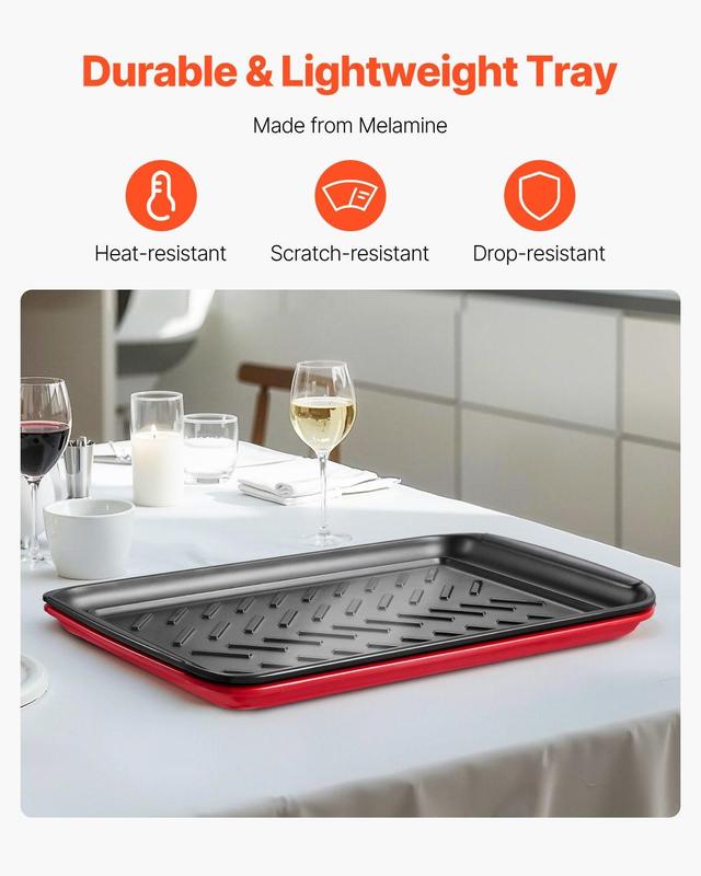 ·2-Piece Set of 2 Colors: Our food trays include one red tray and one black tray, each measuring 17.01 x 10.35 x 1.97 inches / 432 x 263 x 30 mm. With a larger surface area, they can easily hold a variety of items. When stored, they nest together, saving you space