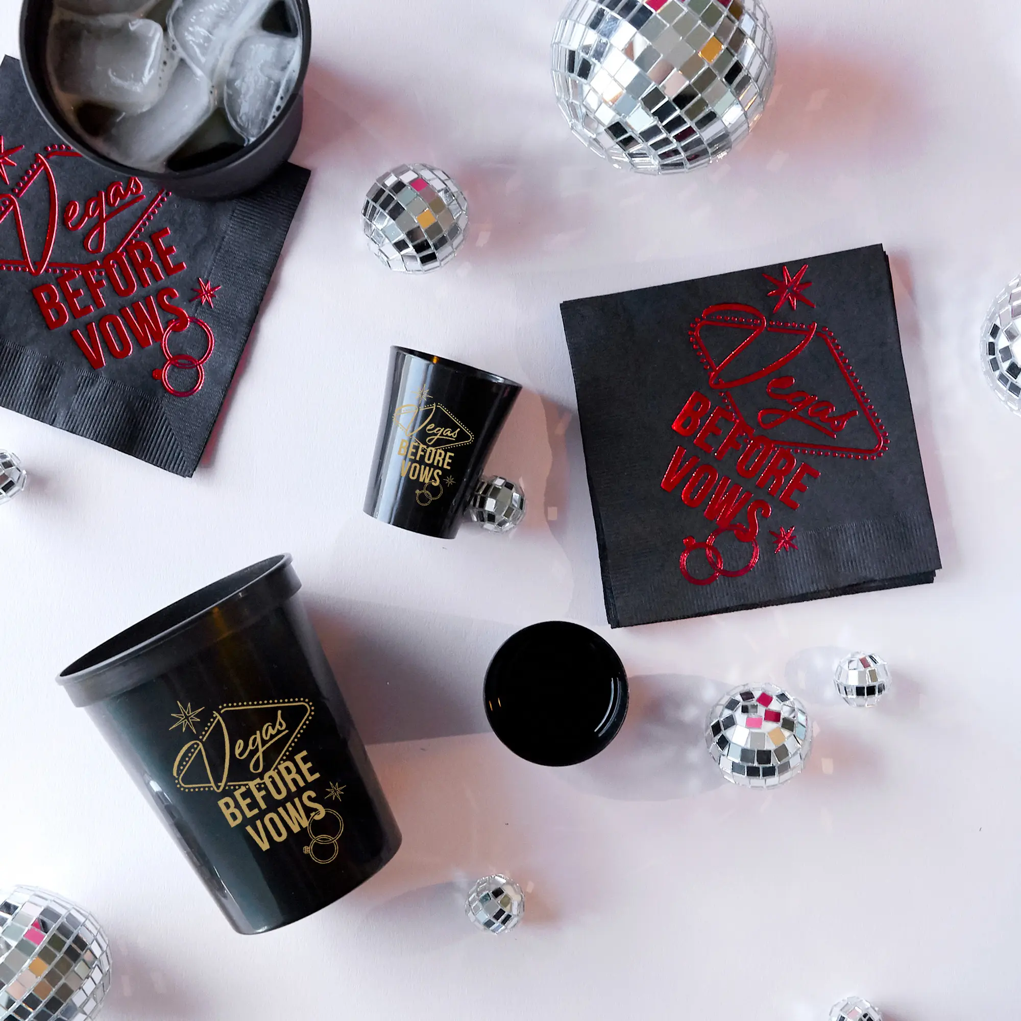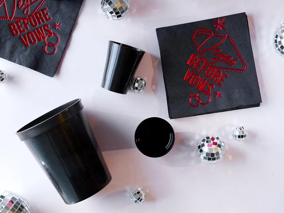 These Bachelorette Plastic Shot Glasses are the perfect addition to any Las Vegas based, or themed party! The pack of 12, 2oz shot glasses will make sure everyone has a drink in hand while celebrating. Key Features: - 'Vegas Before Vows' written in red cursive font on a virbant, disposable 2oz black plastic shot cup. These cups are not only stylish and fun, but also safe for use! Made with BPA-free plastic material, dishwasher safe for easy cleaning, and recyclable! PRODUCT DESCRIPTION Pack of 12, 2 oz Shot Glass 2.375" tall, 1.94" wide at top Recyclable Shatterproof, dishwasher safe Perfect for a bachelorette party, wedding celebration, birthday bash or any festive occasion! These Glam themed party decorations will surely make the event more memorable. Don't settle for plain and boring cups when you can have these cute and festive ones to match your theme. Order now and get ready to celebrate Vegas Before Vows with your girlfriends!