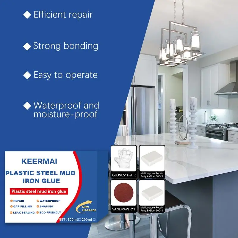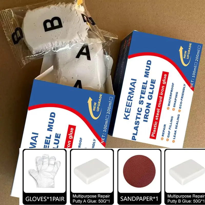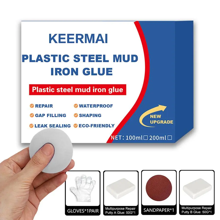 The Plastic Steel Mud Iron Glue is a versatile adhesive designed for various repair needs. It offers high strength and waterproof properties, making it ideal for leak repairs. This multi-functional AB glue can bond ceramic tiles effectively. Available in 100ml and 200ml sizes, it's perfect for both small and large projects.