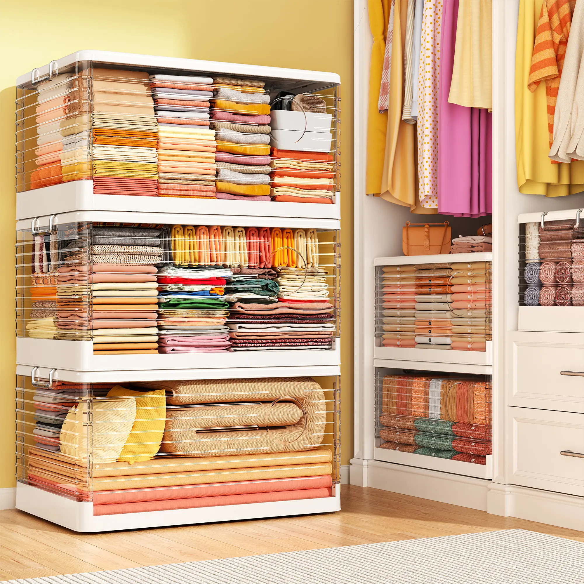 ·Stackable Design:Here’s a surprise for you! If you're living in a dorm or a smaller room with lots to store, this collapsible storage bins is your perfect match! It takes up minimal space, and its stackable design maximizes every inch, giving you more storage options. It's your ultimate storage sidekick!Versatile Use: Forget about limited use! This closet storage bins is more versatile than you think! It’s perfect for food storage, clothes and even kitchen tools and utensils. Heading outdoors? Take it with you as a handy storage container!