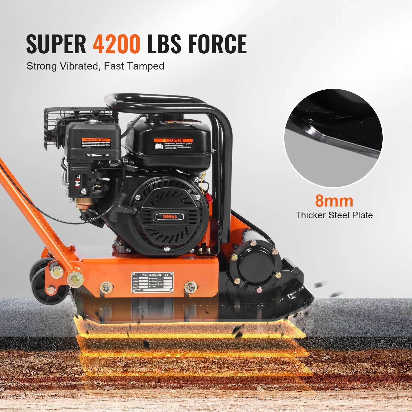 • Work Like Never Before: Upgrade your road projects with our plate tamper! With an enlarged 351 in² stamped plate, you'll save time with an impressive working efficiency of up to 7300 ft²/h. Plus, the plate is built to last with its durable 8 mm thickness that won't deform even during tough tamping jobs.