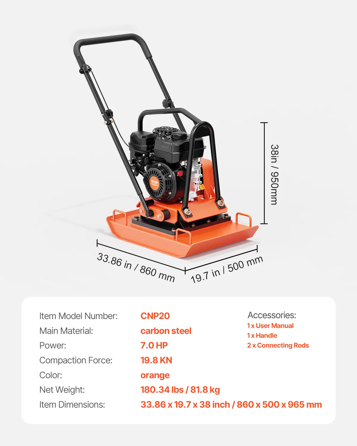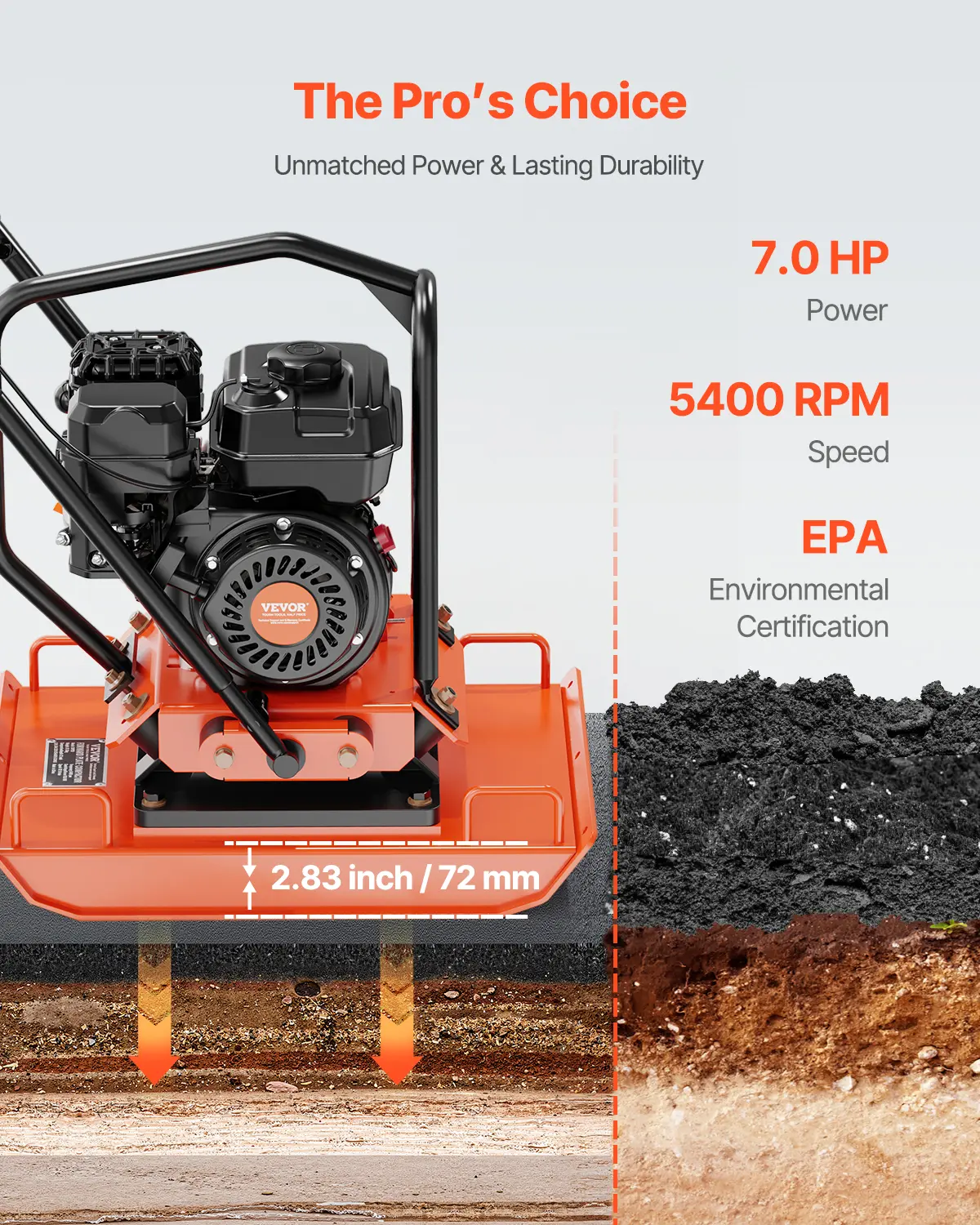 • Durable Construction: This professional compactor's excellent engine can reach a speed of 5400 RPM, helping you compact the ground quickly. The 2.83 in thick compaction plate can last for a long time without fear of damage. Our compactor is EPA-certified (Certificate Number: RCGPS.1961GR-011), ensuring low gas emissions for a cleaner and healthier atmosphere.