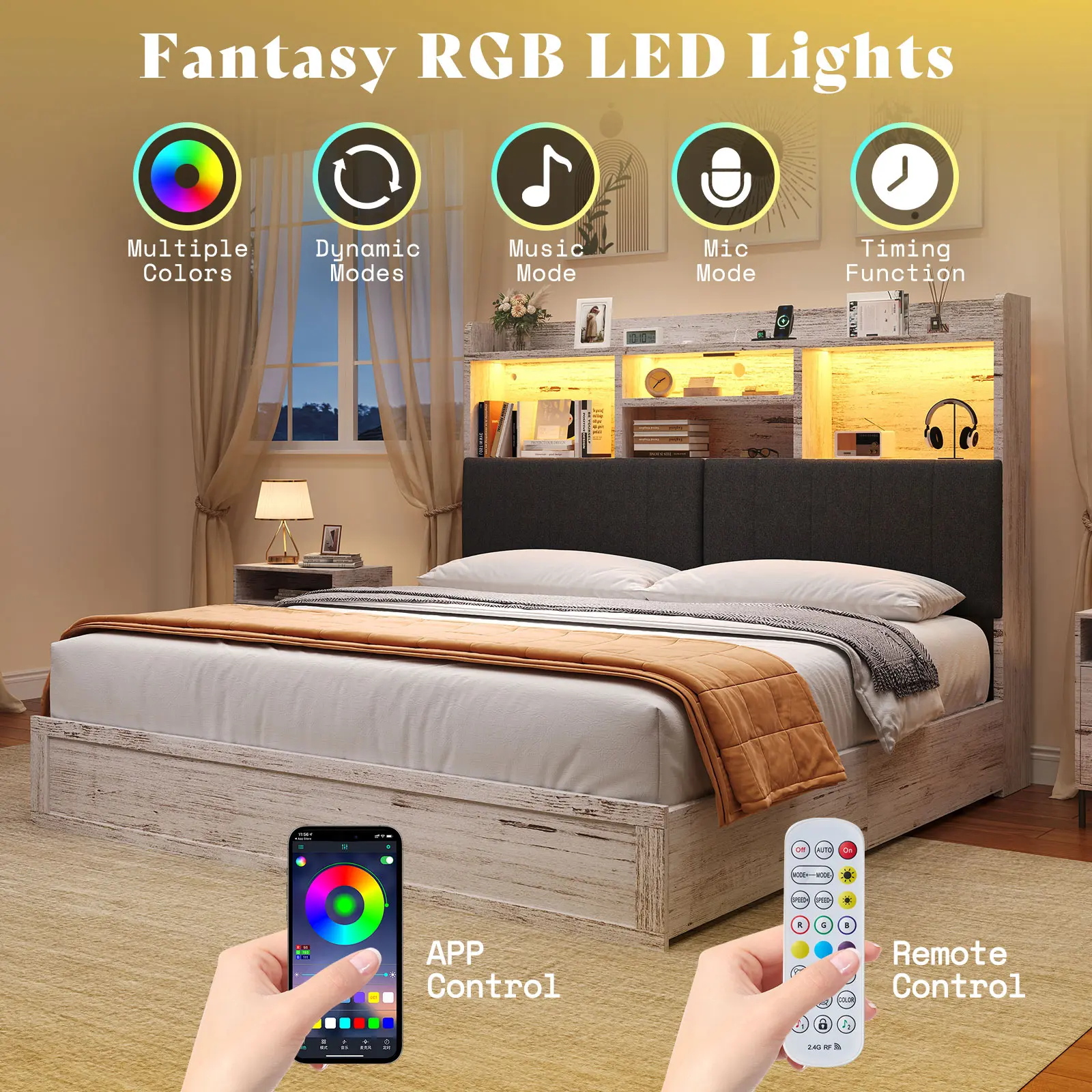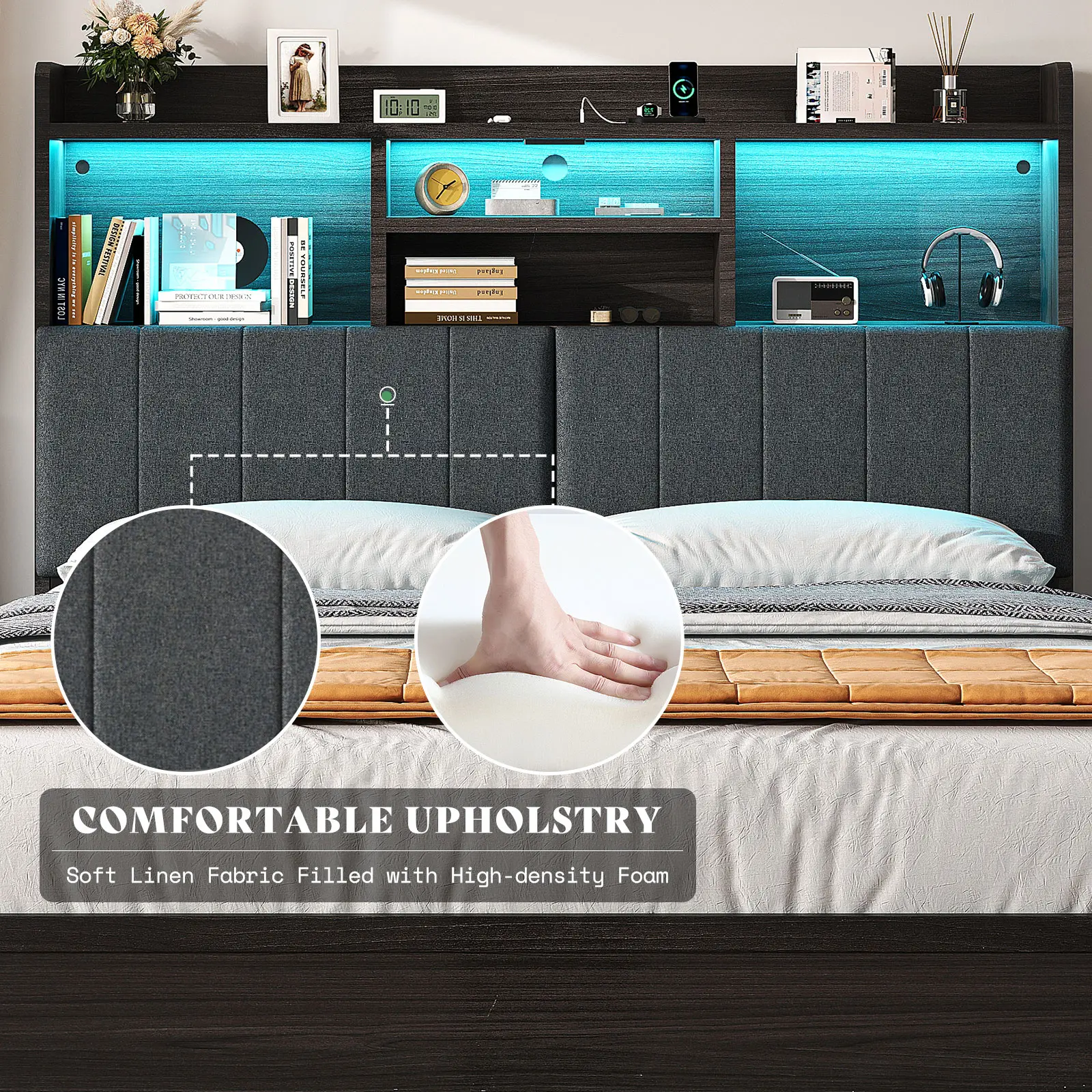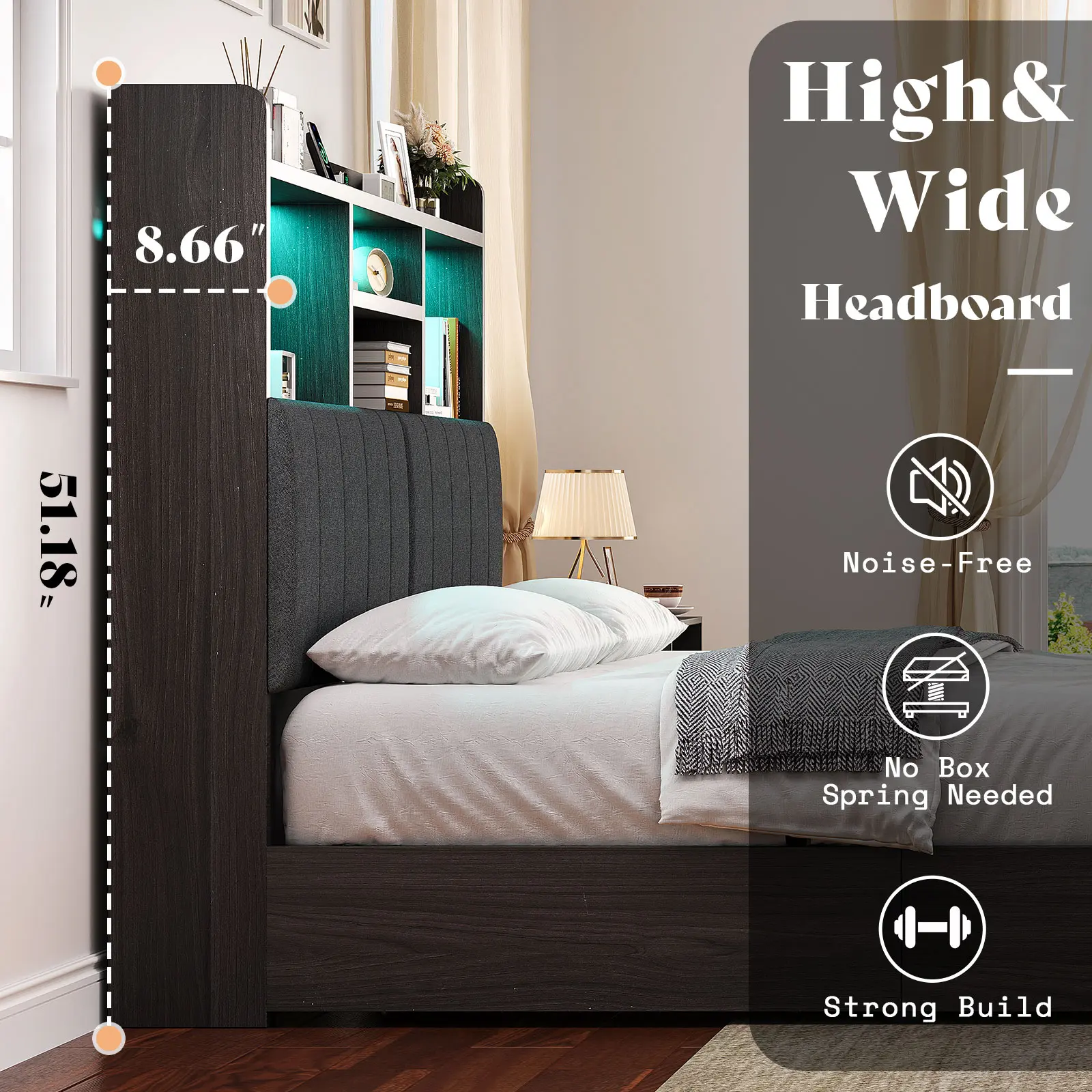 ·51.2" High Headboard: Features a bookcase-style design with shelves for easy storage, soft linen upholstery for comfort, hidden storage behind the upholstery, and a built-in charging station to keep essentials organized and devices powered