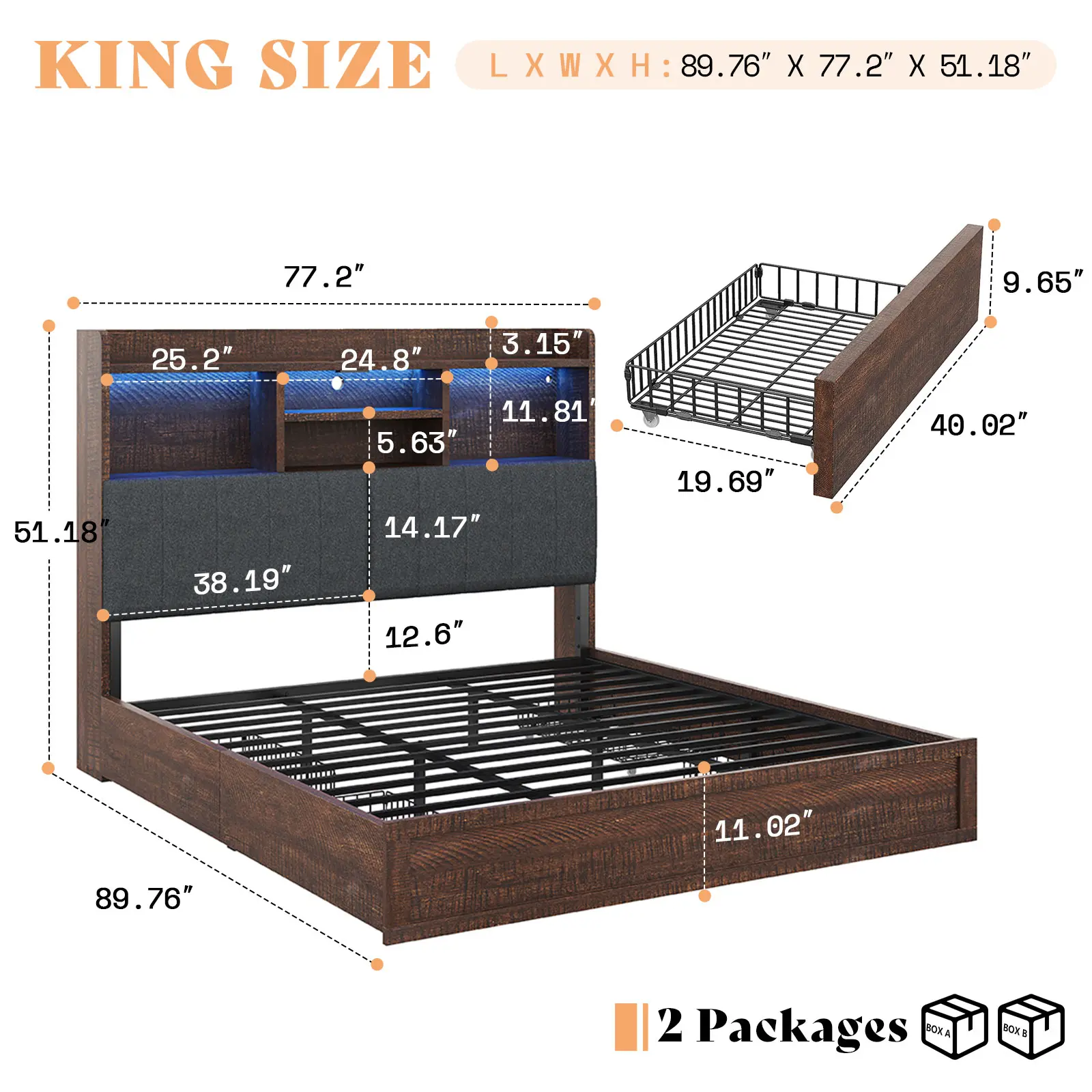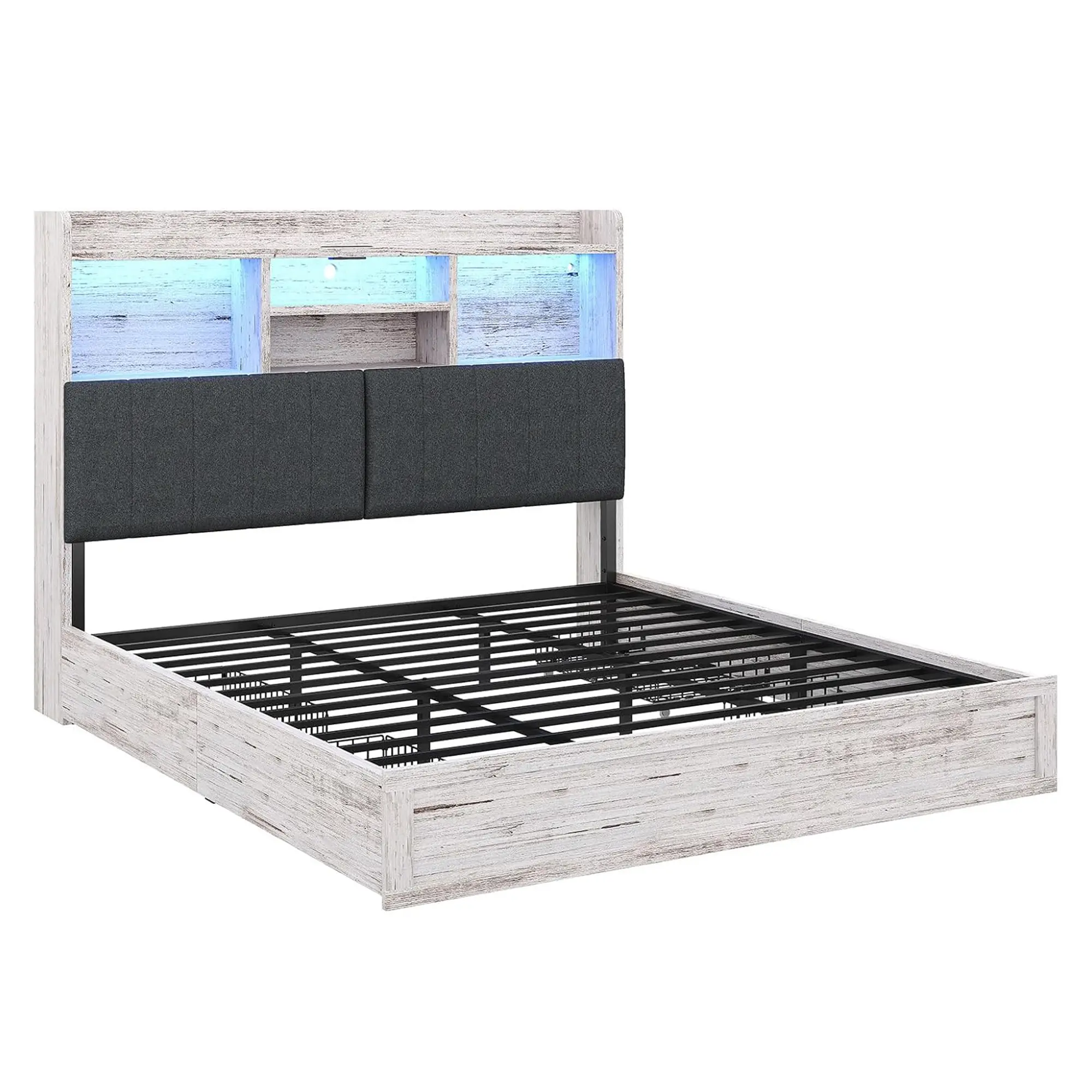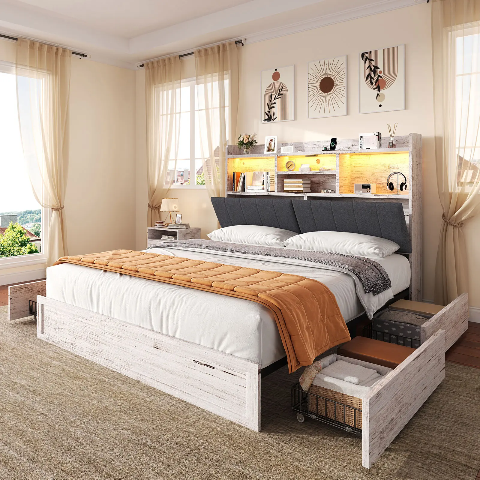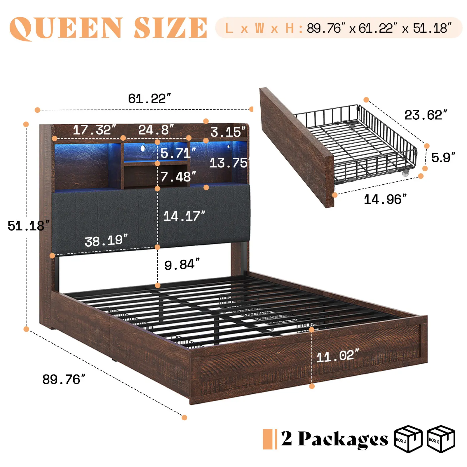·51.2" High Headboard: Features a bookcase-style design with shelves for easy storage, soft linen upholstery for comfort, hidden storage behind the upholstery, and a built-in charging station to keep essentials organized and devices powered
