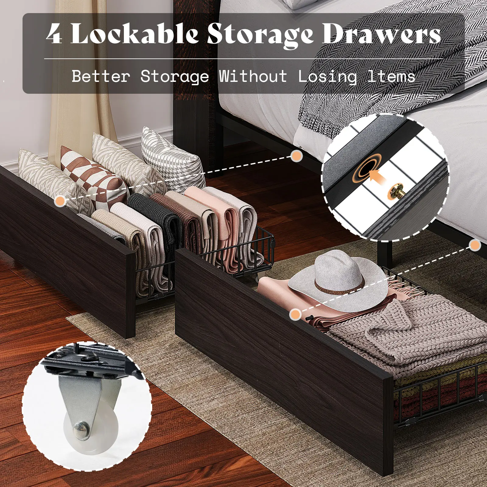 ·4 Lockable Drawers with Wheels: Features four spacious drawers with smooth-rolling wheels and lockable design, ideal for storing clothes, bedding, and more while keeping your space tidy and organized