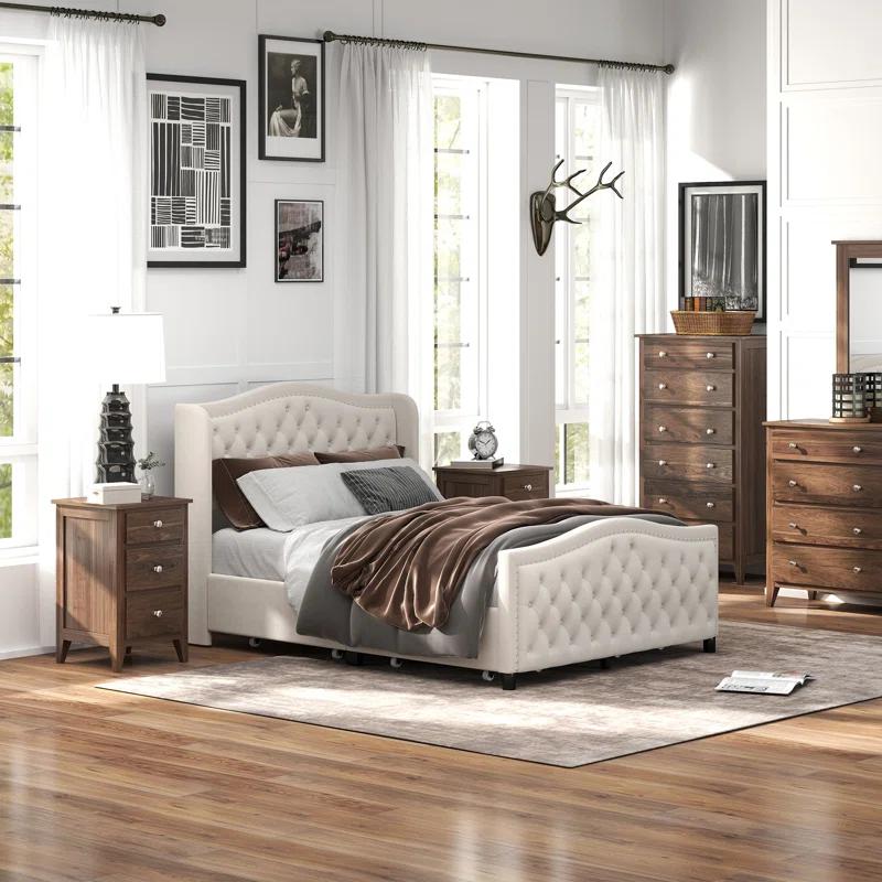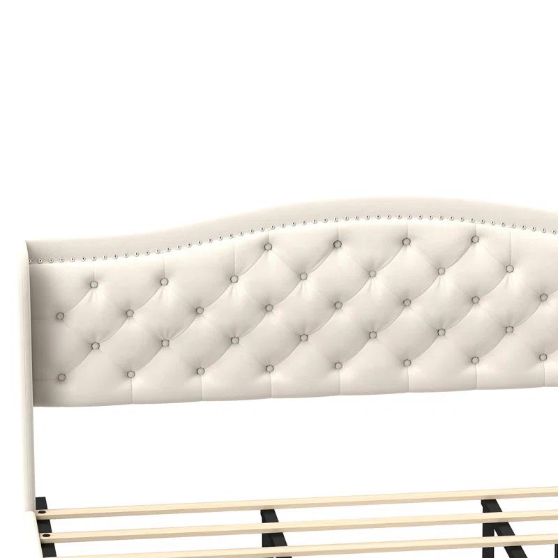 Experience the epitome of luxury and functionality with this upholstered platform bed. Adorned with a lavishly tufted camelback headboard (and footboard) and accented by gleaming nailhead trim, this piece adds a bit of opulence to your bedroom décor. It has a metal and solid and engineered wood frame that's wrapped in velvet with foam-padded for extra support. The best part? Four built-in drawers provide ample storage for linens, clothes, and more. A distinctive slat system eliminates the need for a box spring, so all that's left to get is a mattress of your choice (sold separately).