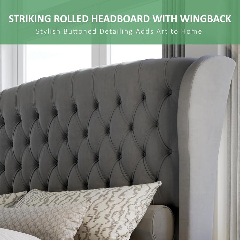 AMERLIFE Platform Bed Frame,Velvet Upholstered Sleigh Bed with Scroll Wingback Headboard&Footboard/No Box Spring Required/Christmas Gift/Best Gift Ideas