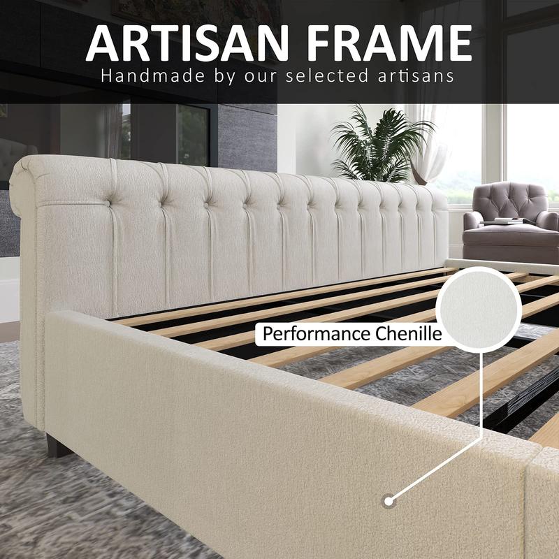 ·ARTISAN STYLE - Upholstered Bed is designed & handmade by our selected artisans. Hand-sewn in premium chenille fabric, hand-applied button tufting add individuality and art to home.