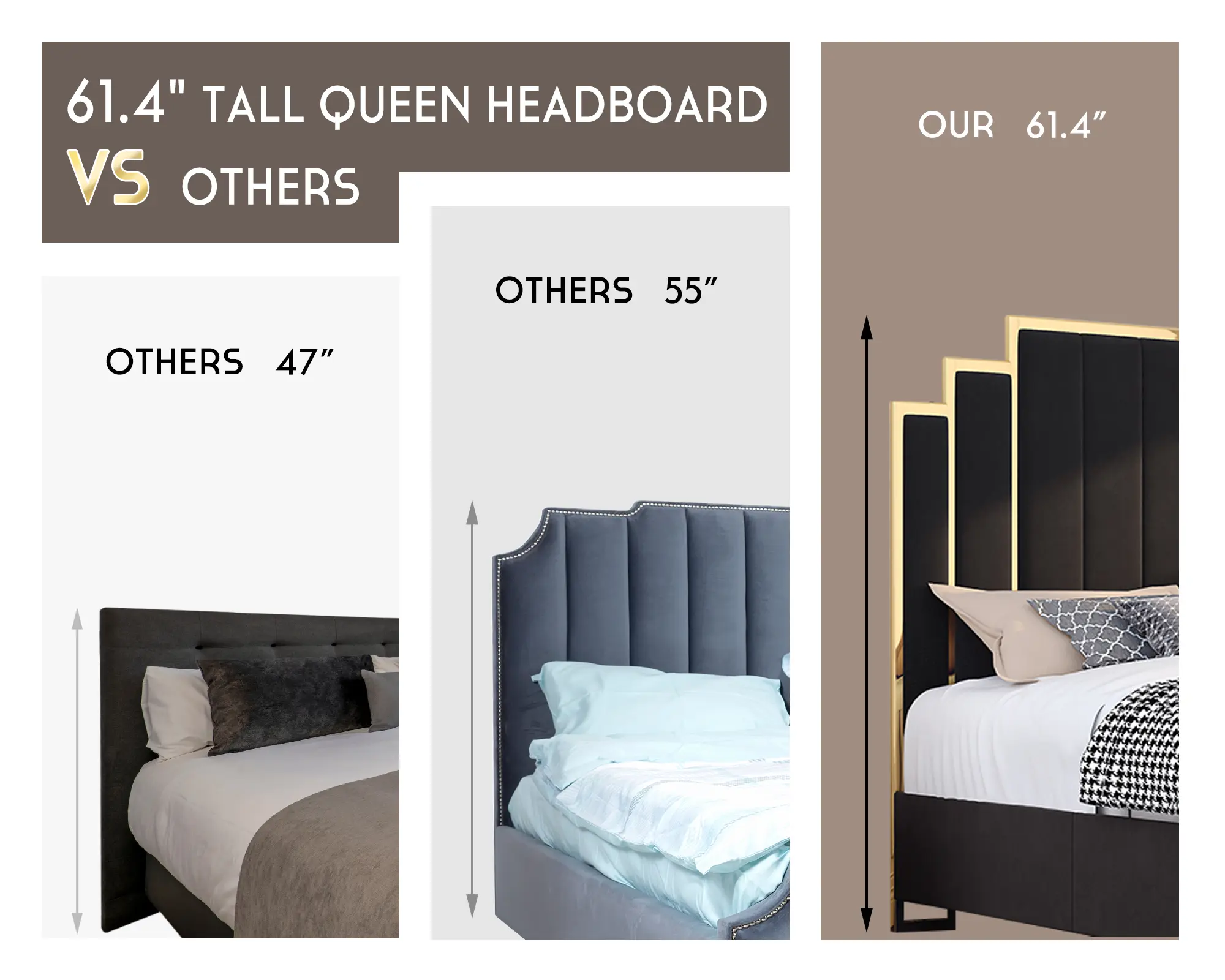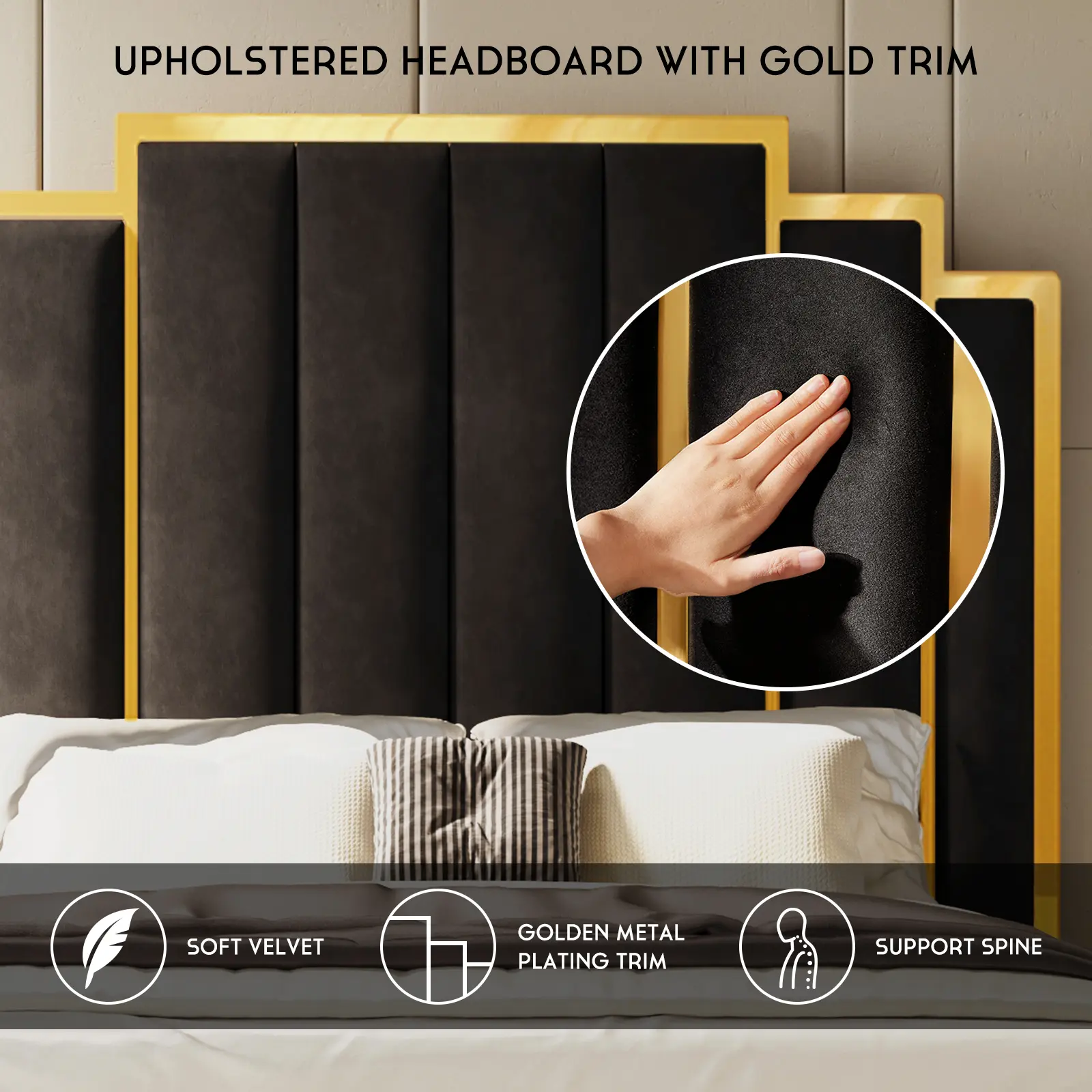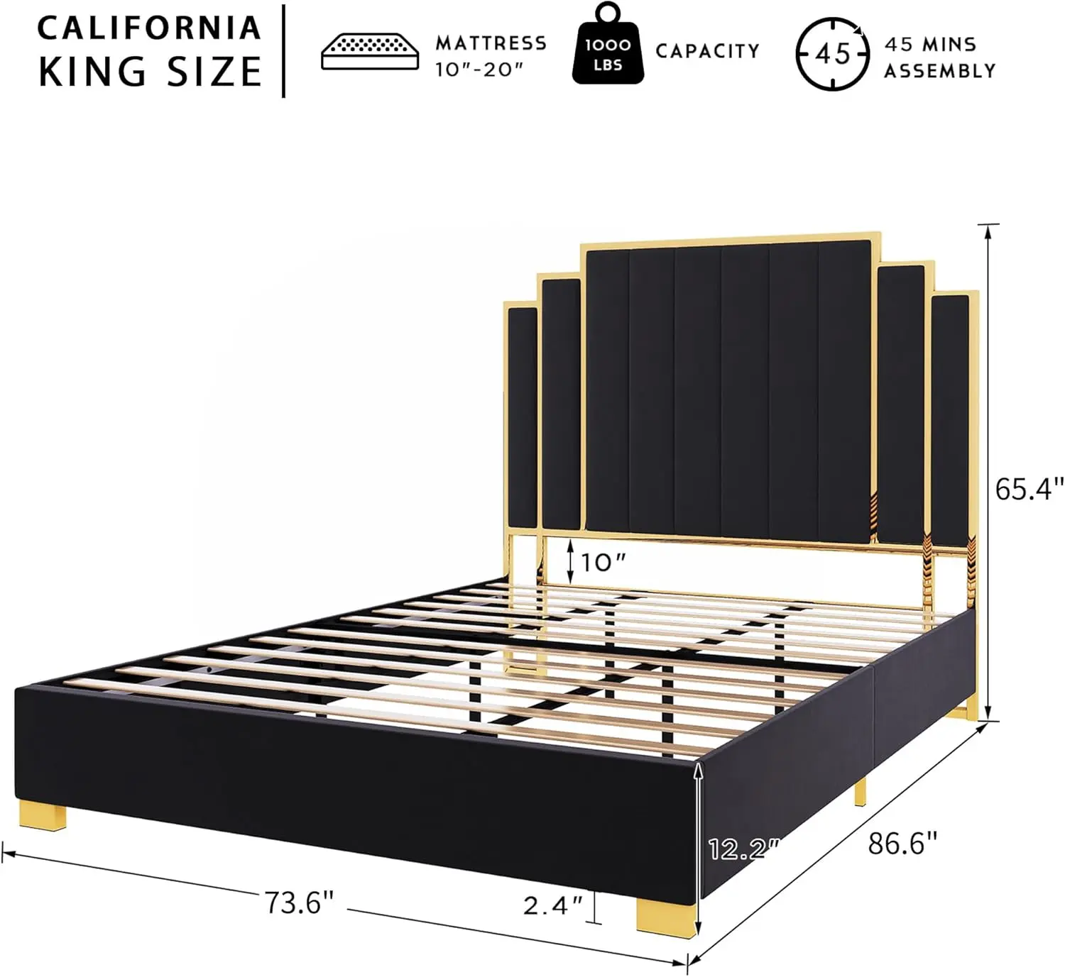 The AMERLIFE Platform Bed Frame with a high headboard(61" for Queen, 65" for King) in luxurious velvet upholstery is a stunning addition to any bedroom. The plating gold trim on the headboard adds a touch of glamour to the design.