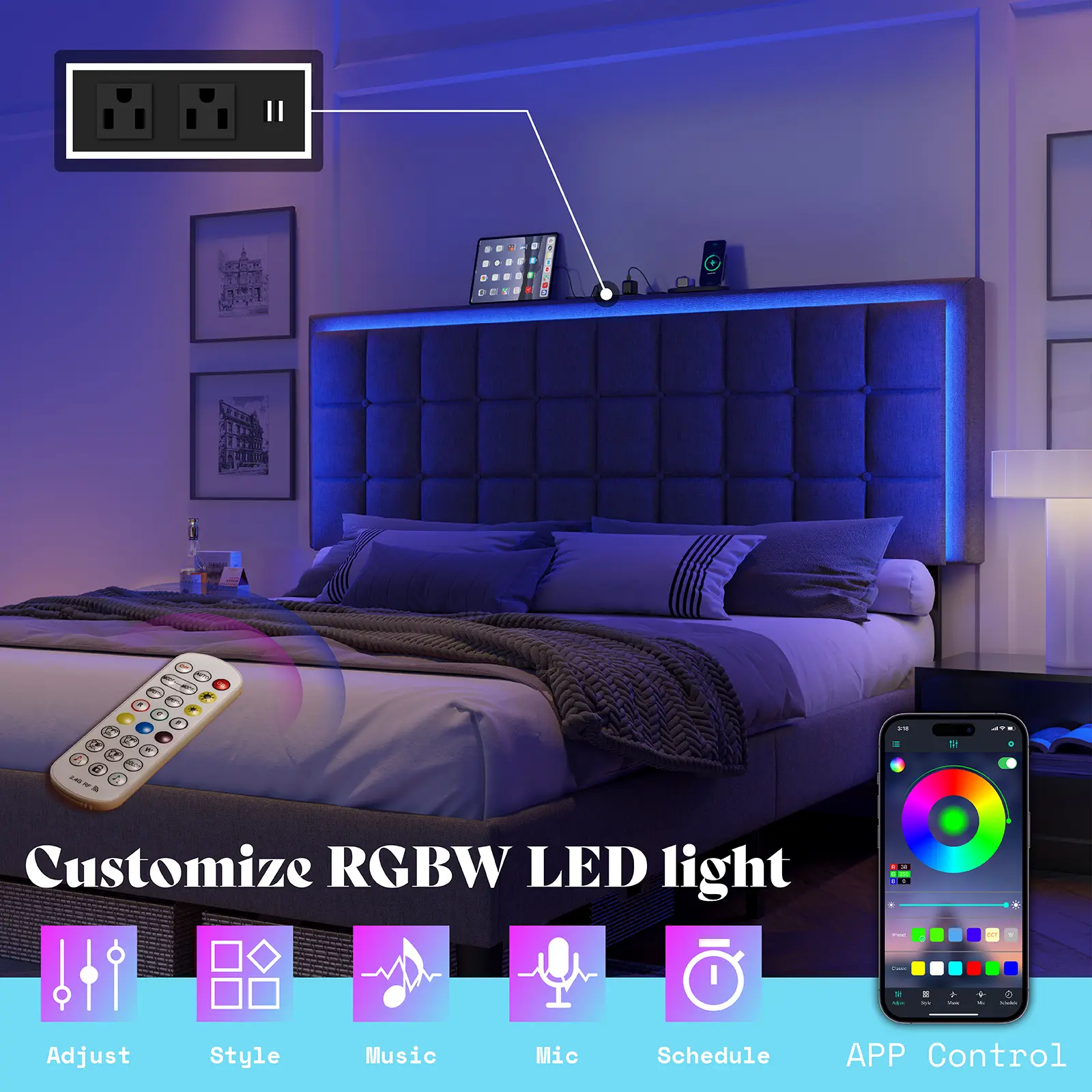 Luxurious LED Bed Frame: Elevate your bedroom with our Deluxe LED Headboard, offering a lavish RGBW experience. Control the lights via App/Remote, with customizable settings like timed modes, switching options, adjustable brightness, and rhythmic patterns.