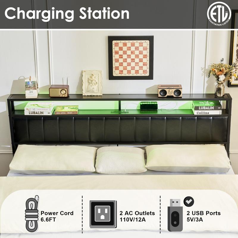 AMERLIFE Platform Bed Frame, LED Bed Frame with PU Leather & Charging Station, 2-Tier Storage Headboard/No Box Spring Needed/Noise Free