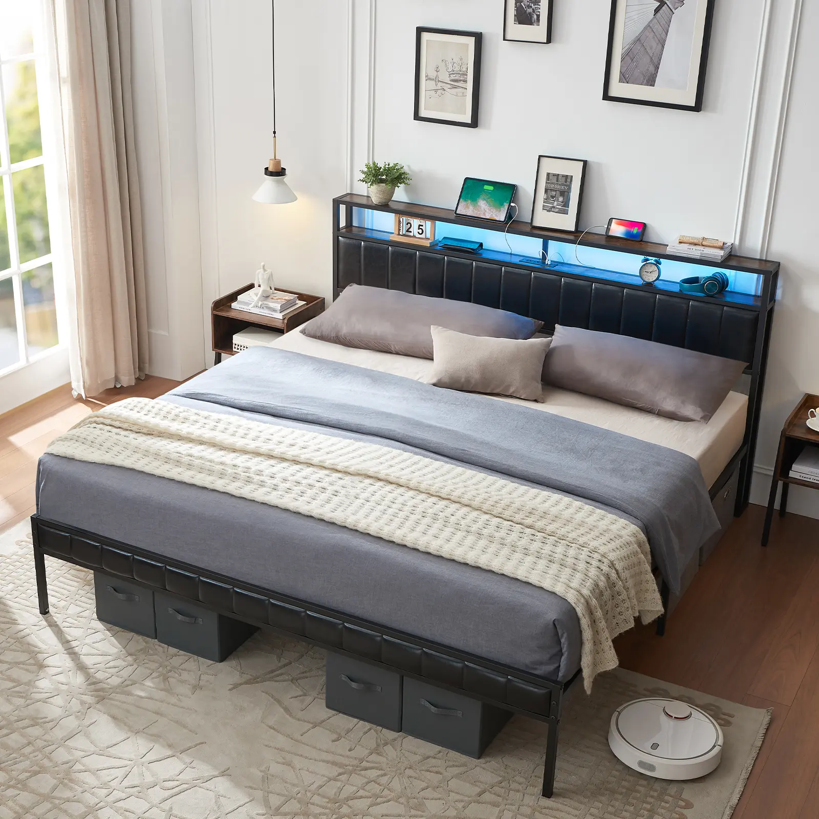 ·Storage Bed frame: 2-tier storage shelves make it convenient to keep essentials within reach. The 13" under-bed space of the LED bed frame allows for easy cleaning and storage.