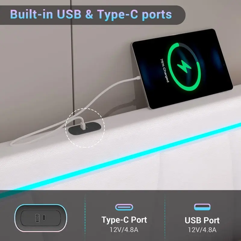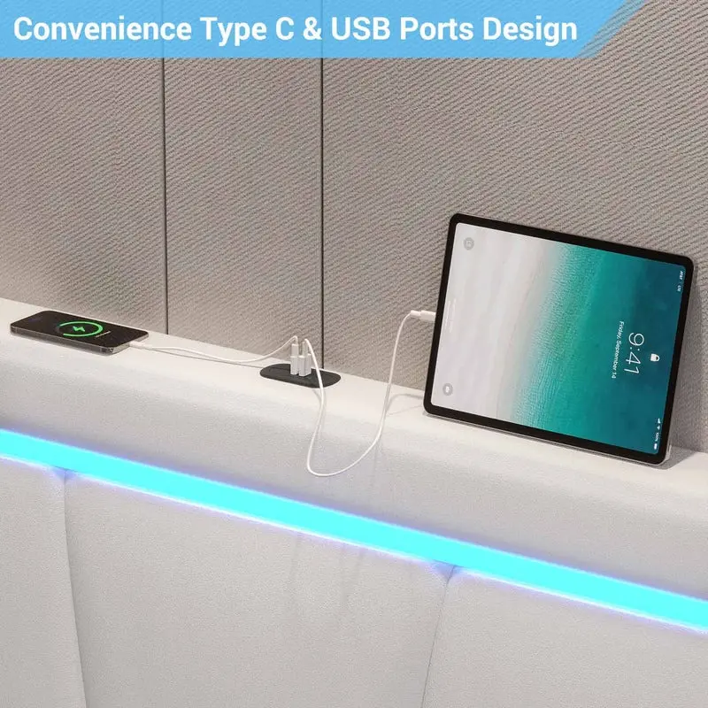 Modern Smart Led Bed Frame with Headboard and USB Outlets