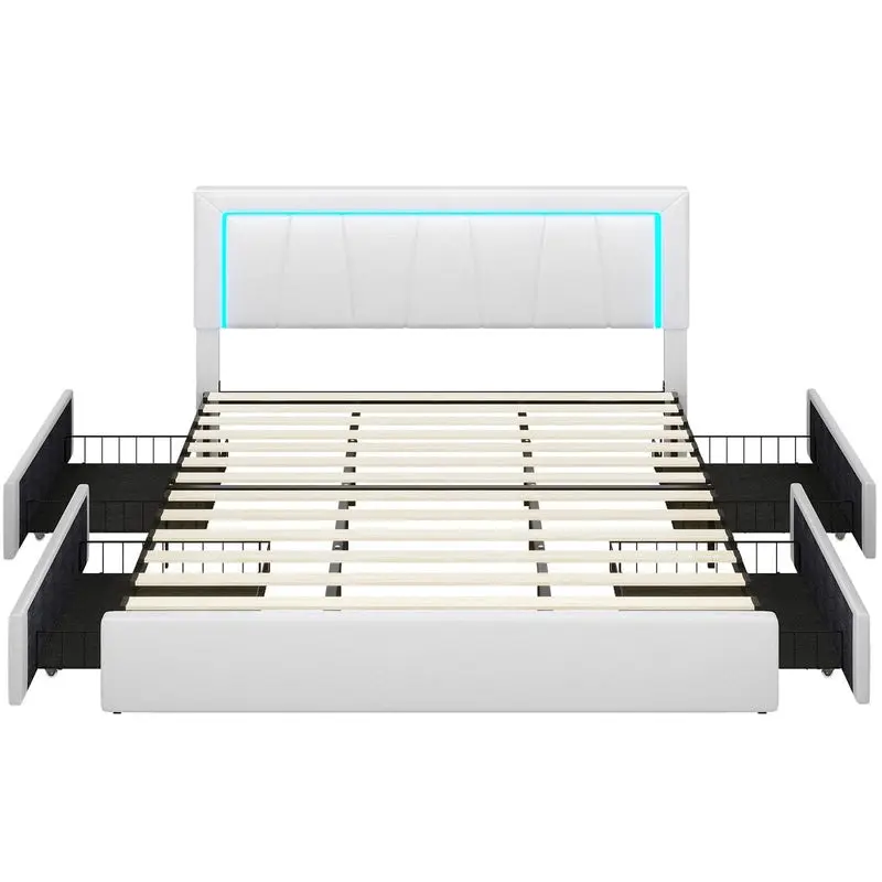 5. Sikaic Faux Leather Platform LED Bed Frame With Storage Drawers And USB Ports Adjustable Headboard White Furniture Modern Interior Design Luxury