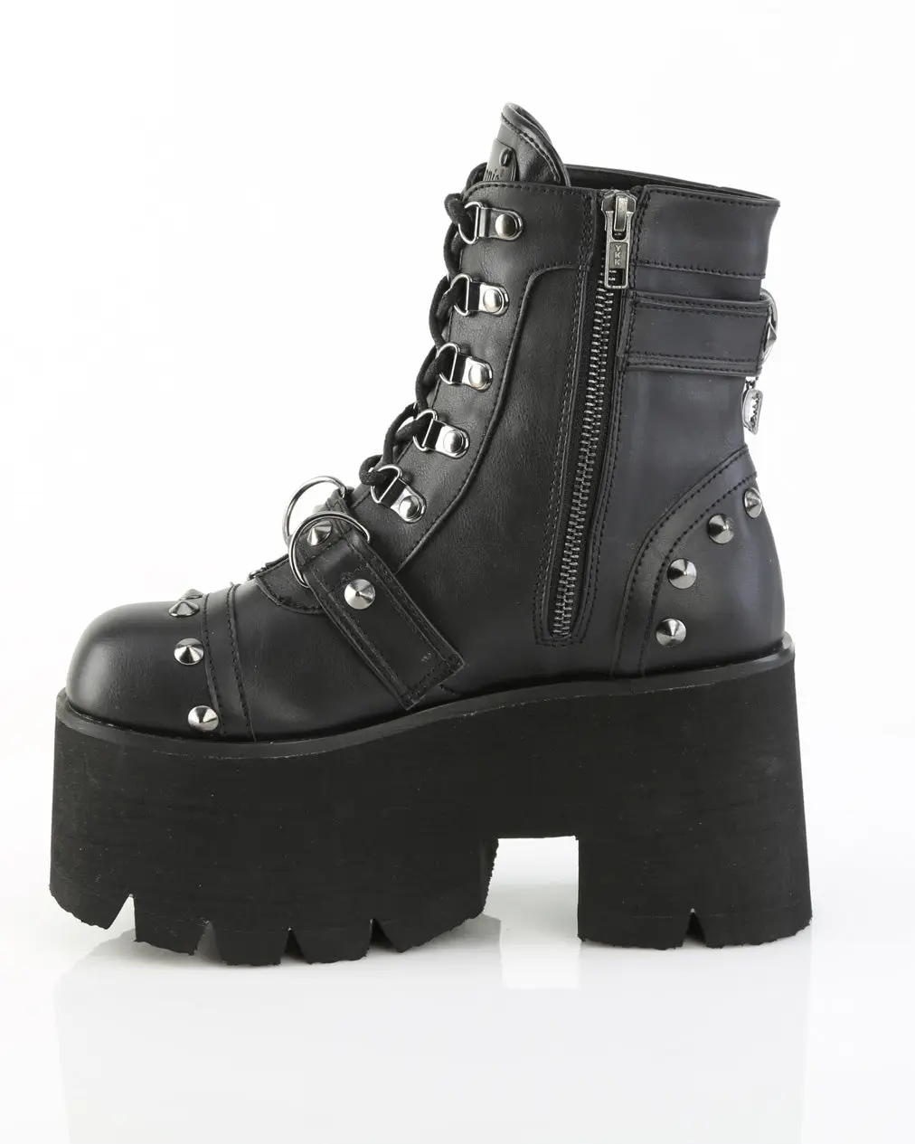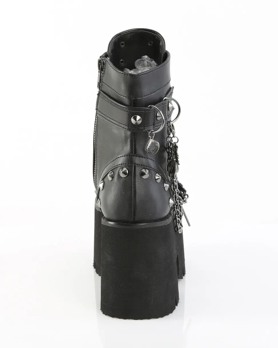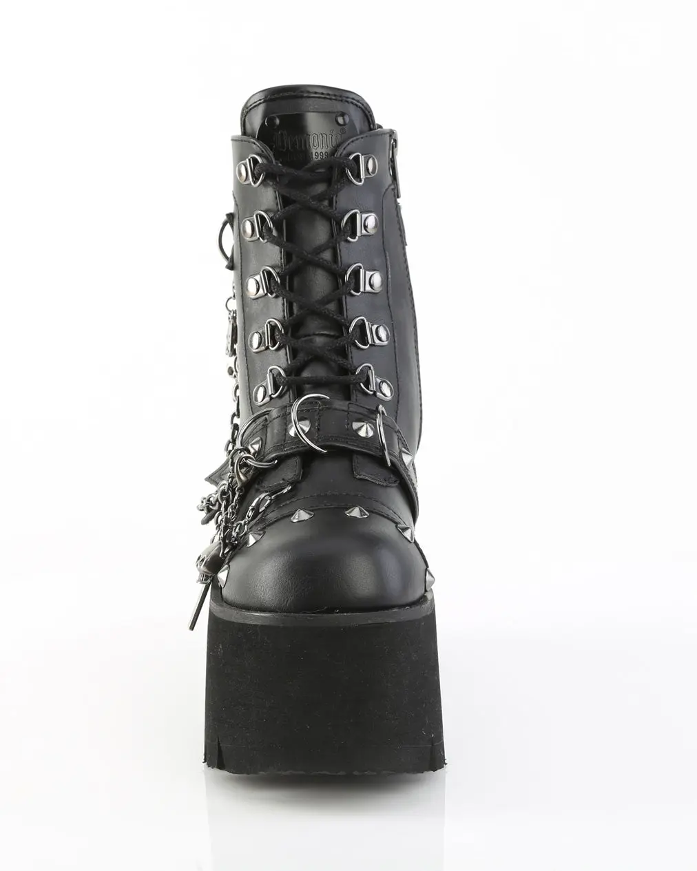 3 1/2" (90mm) Chunky Heel, 2 1/4" (57mm) Cut-Out Platform D-Ring Lace-Up Ankle Boot Featuring Metal 'Demonia' Branded Tongue, Cone Stud & D-Ring Details & Chain with Various Hanging Charms, Metal Side Zip Closure