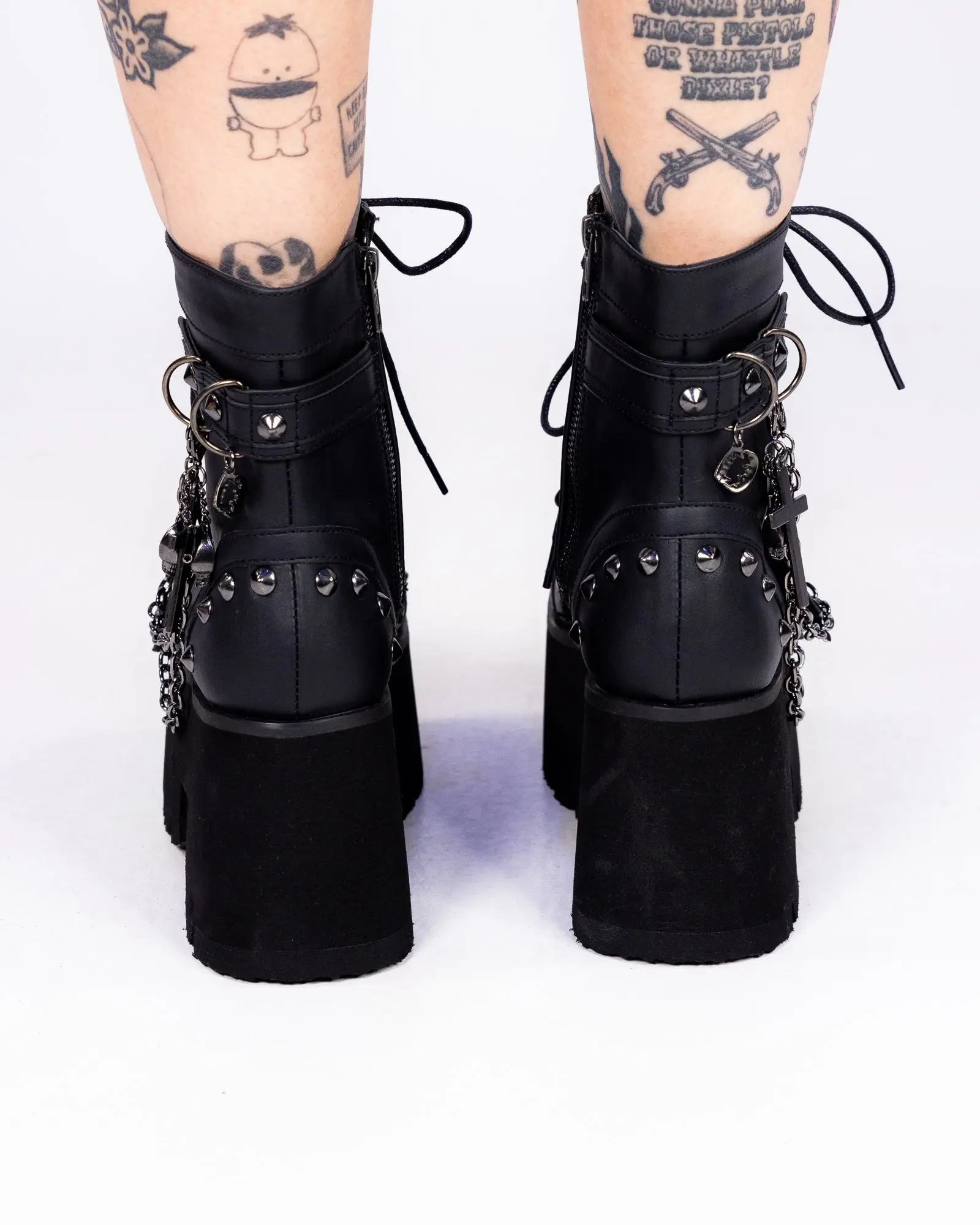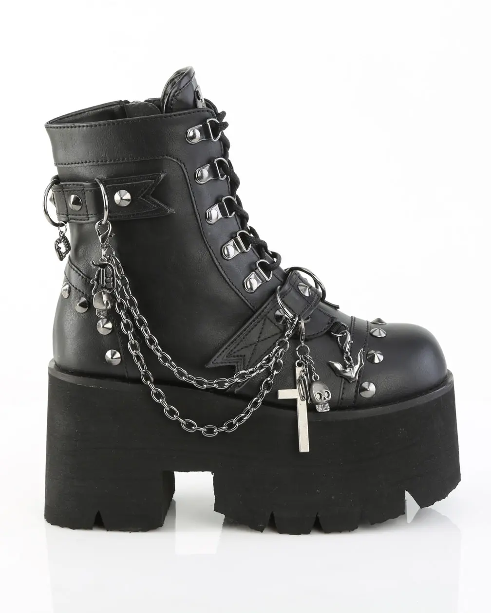 Unleash your inner rebel with these Demonia Ashes platform boots! Embellished with dangling chains, spike details, and silver skull and bat charms, these boots are perfect for everyday wear or for rocking out at music festivals! Take the risk and elevate your style with these bold and edgy boots!