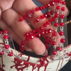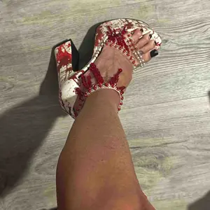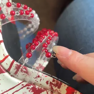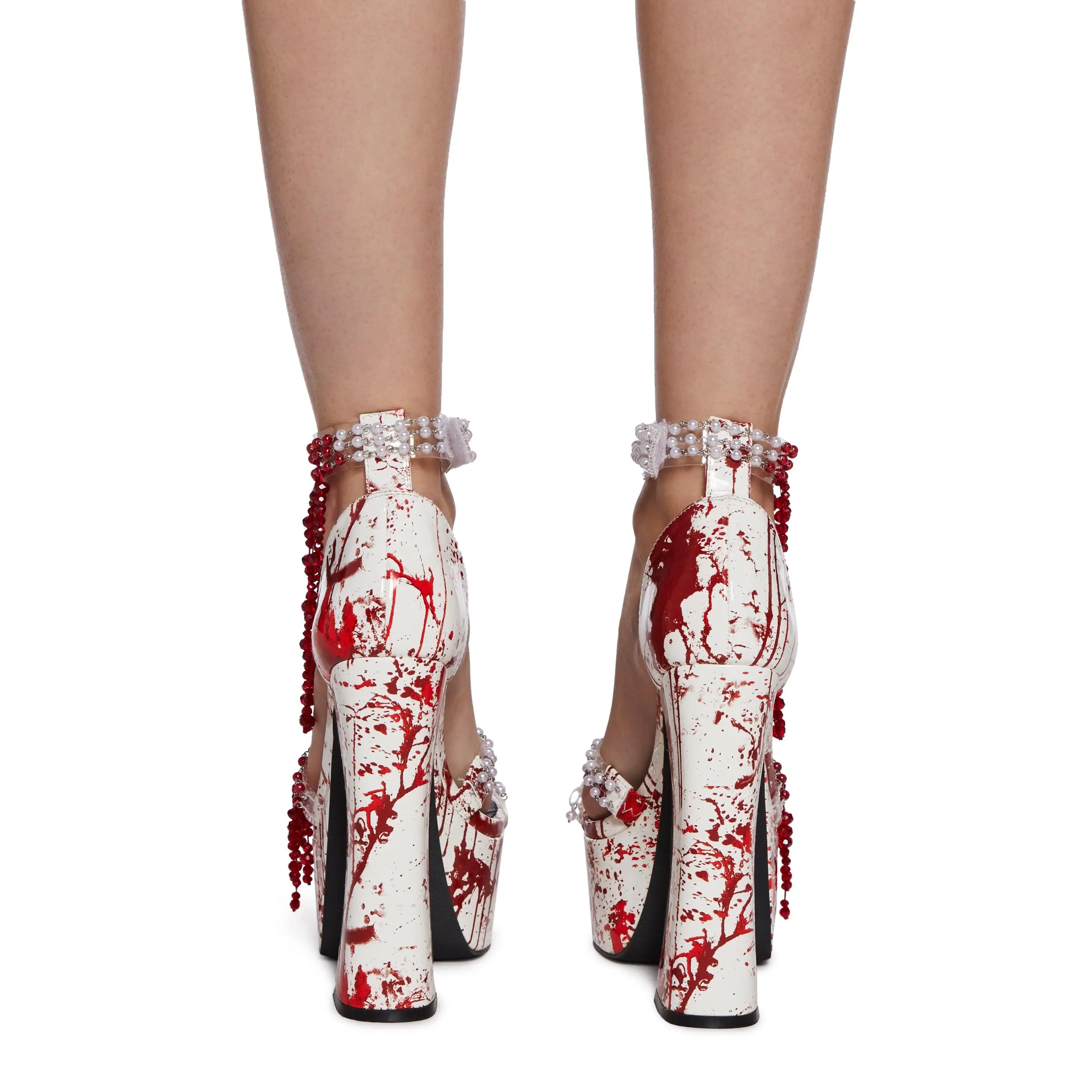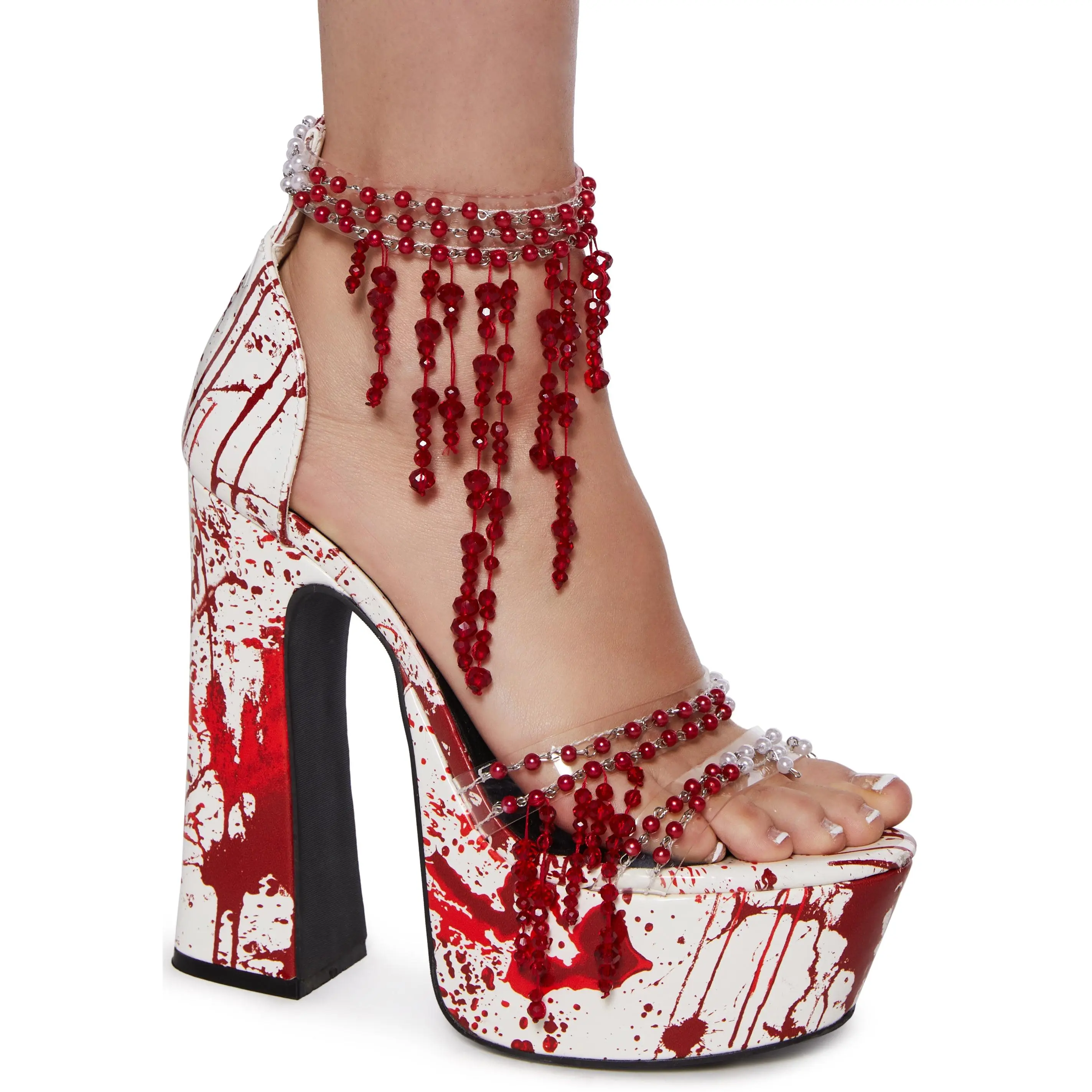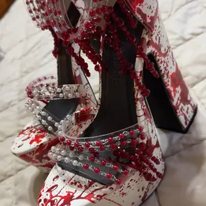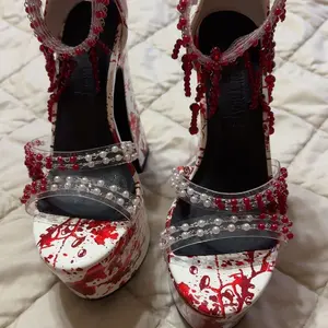 These platform heels have a vegan leather construction, pearlescent and red beaded detailing on vinyl toe straps, a blood splatter printed design, dangling red fringe beading along the ankle, and a velcro ankle closure.