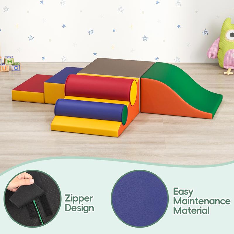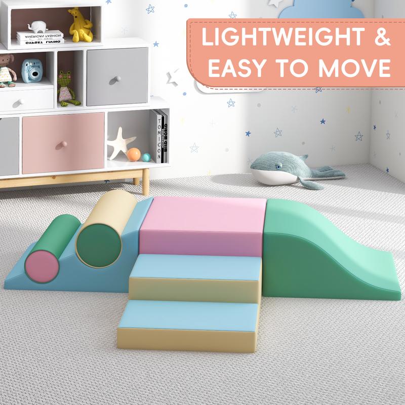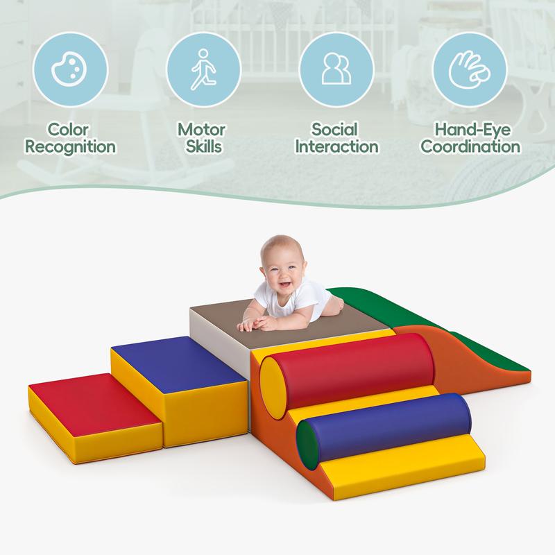 The set includes a slippery slope, square block, two ladder rectangles, two cylinders, and an obstacle bottom bracket, all designed to promote climbing, sliding, and imaginative play. It’s a great way for toddlers to enhance their physical coordination and motor skills.