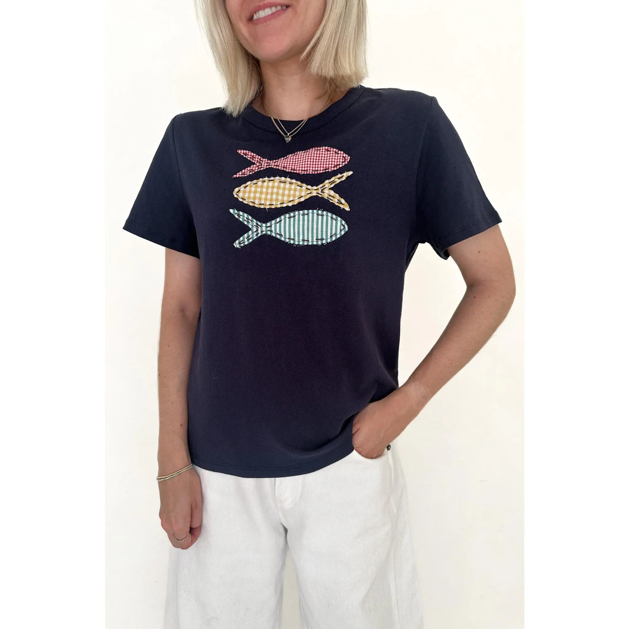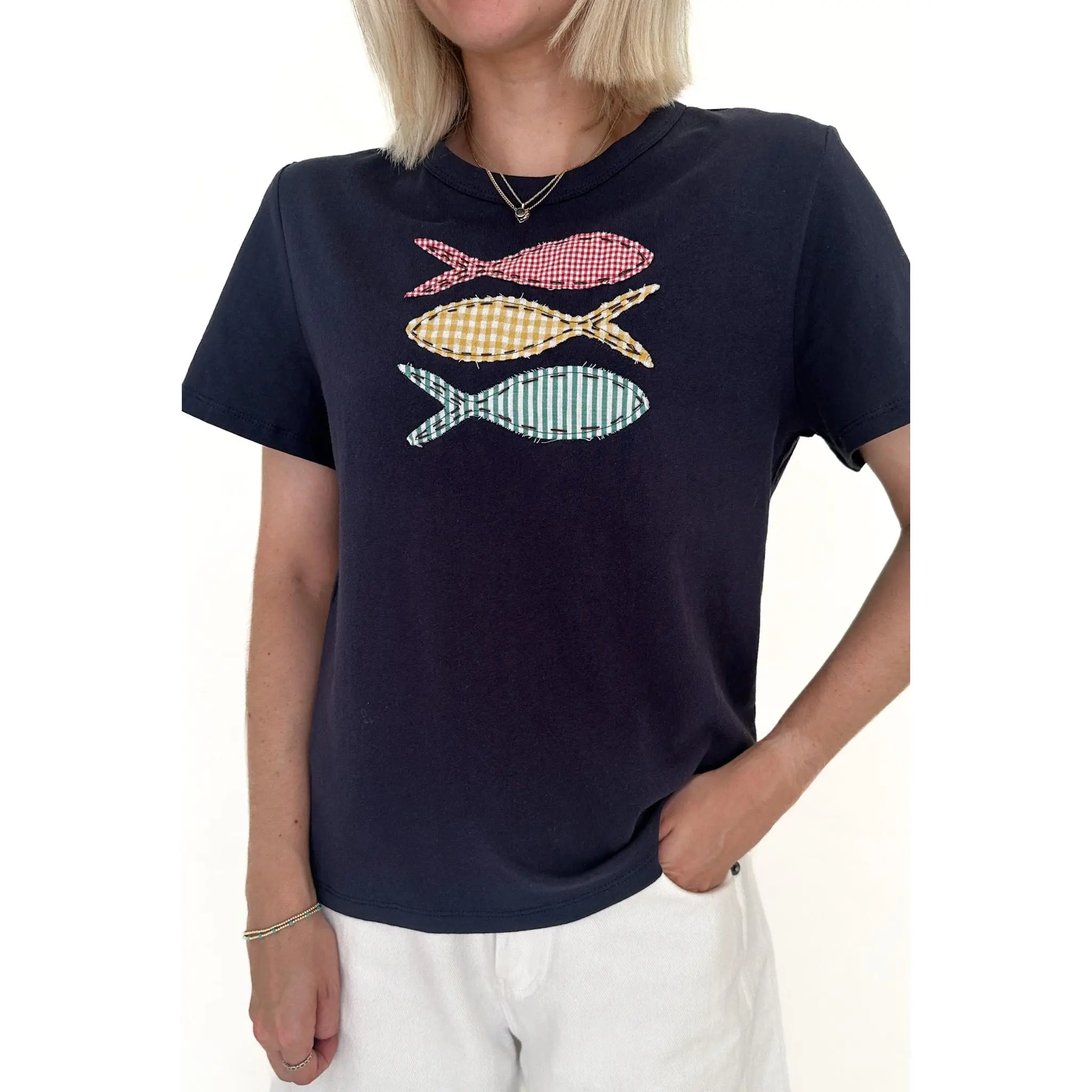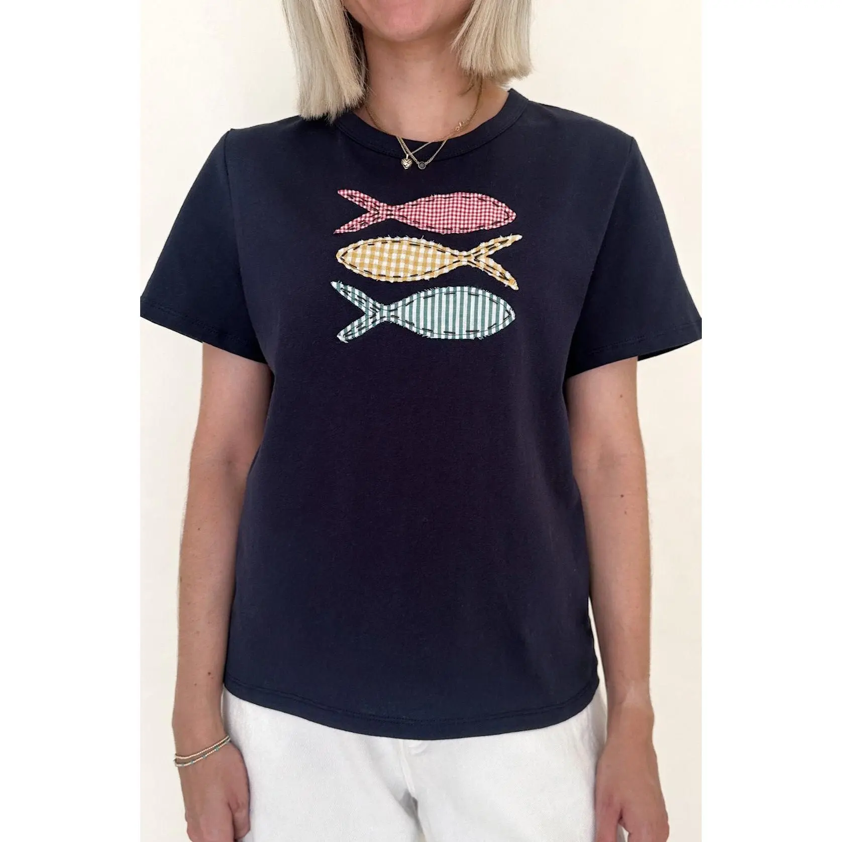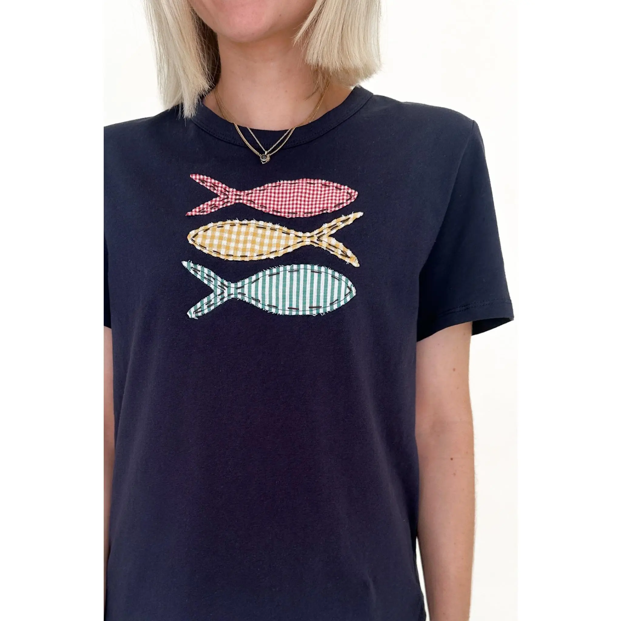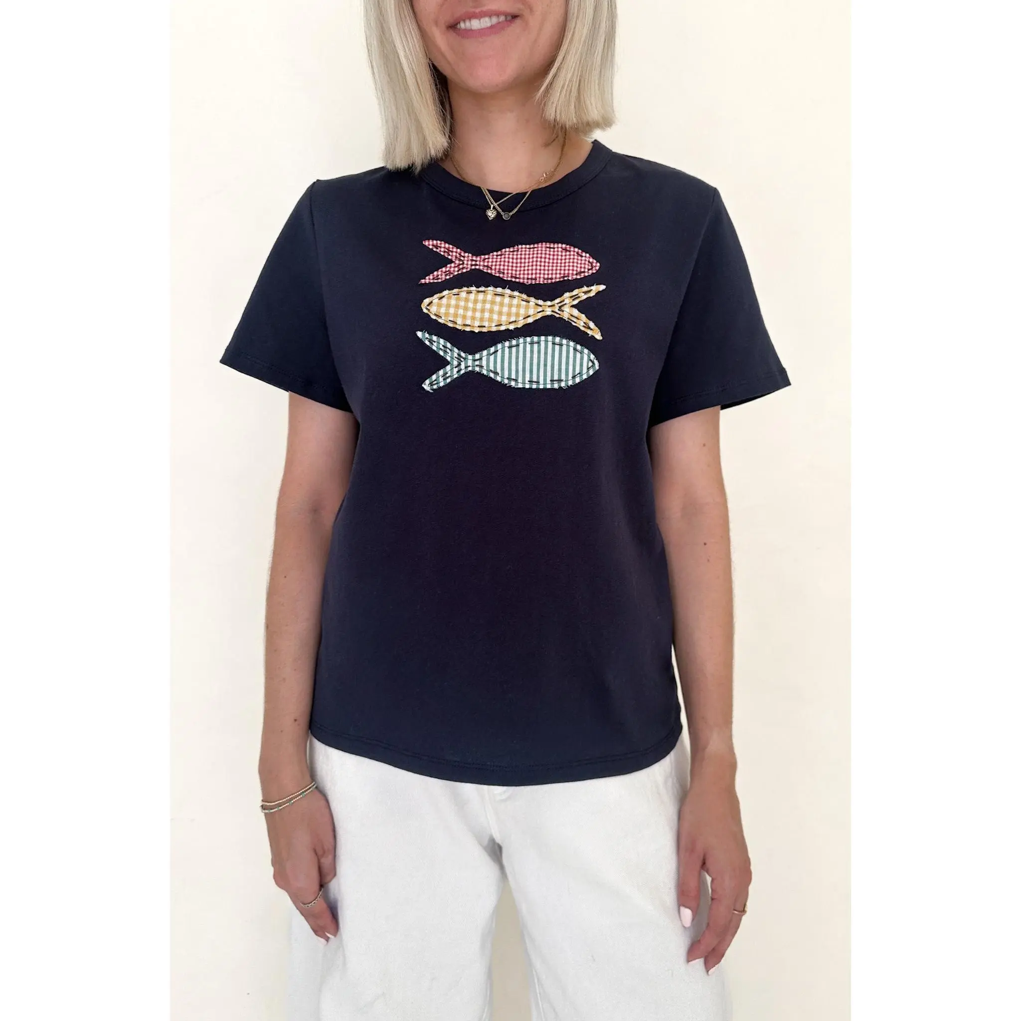 The cutest tee with so much personality! The Be Koi Fish Patch Cotton Tee is a fun basic that can be worn with any bottoms in your closet. Featuring a crew neckline, gingham pattern, patch fish details, navy color and a true to size fit.