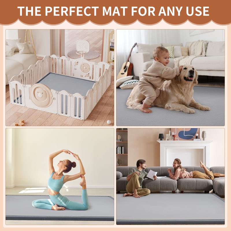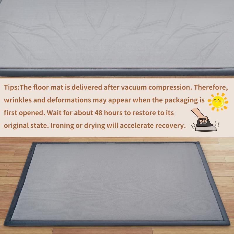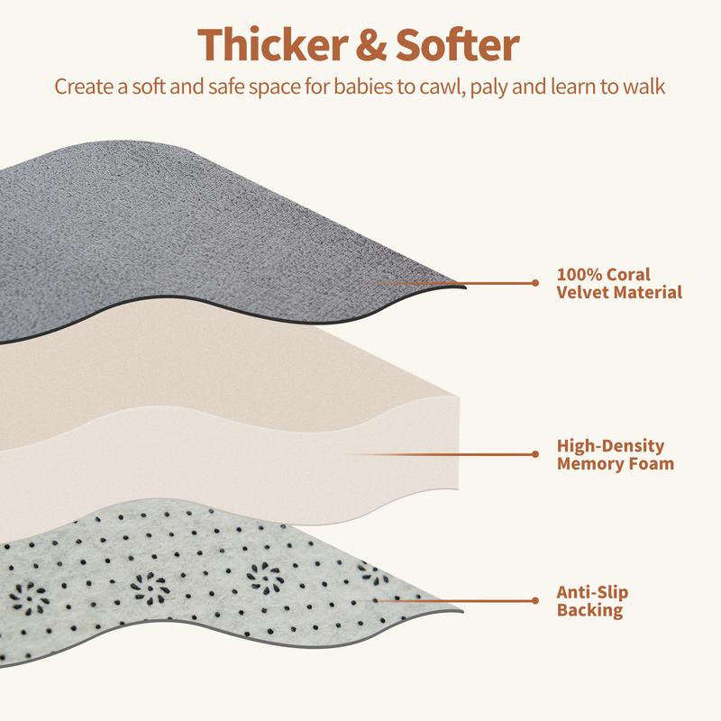 ·THINK COMFORTABLE PLAYMAT - Our play mat features super soft coral velvet fabric with high-density memory foam padding, offering approximately 1.5 inches of thickness. It's breathable, colorfast, and gentle on baby's skin, providing a cushioned surface that helps reduce the impact of falls during playtime