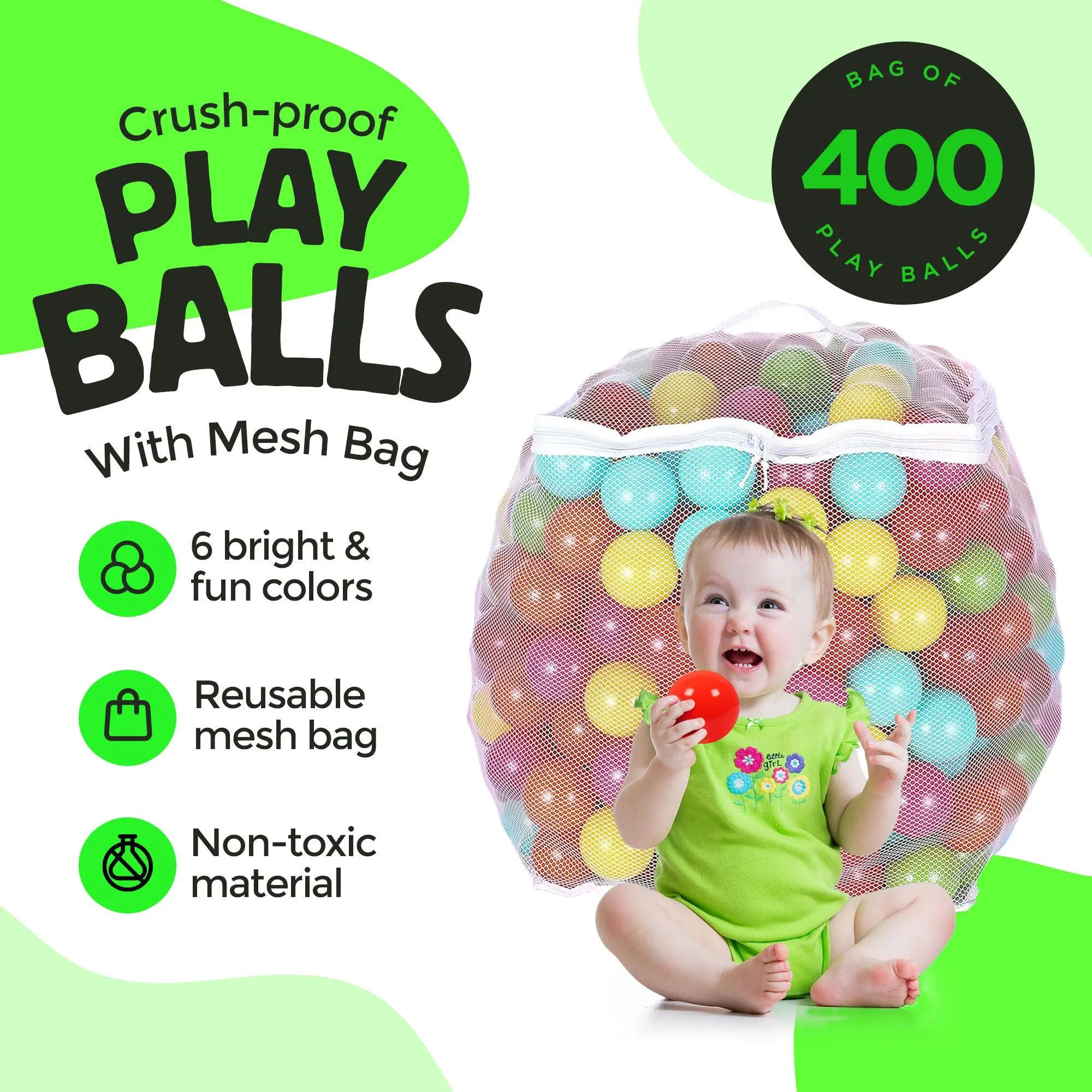 The BalanceFrom Crush Proof Play Pit Balls set includes 400 colorful, 2.3-inch balls in blue, red, pink, green, orange, and yellow. Made from phthalate-free, lead-free, and BPA-free plastic, these durable balls can withstand 100 pounds of force. Perfect for kids 12 months+, they help develop motor skills and coordination. A reusable mesh bag is included for easy storage.