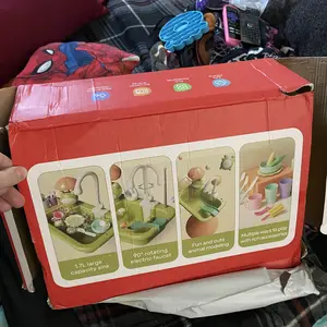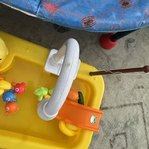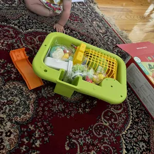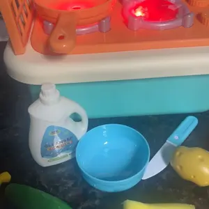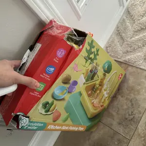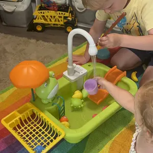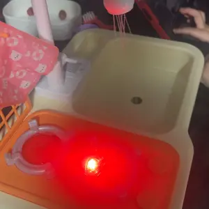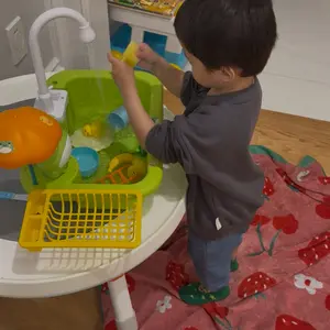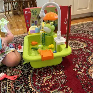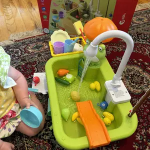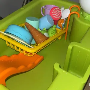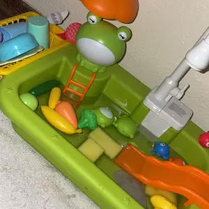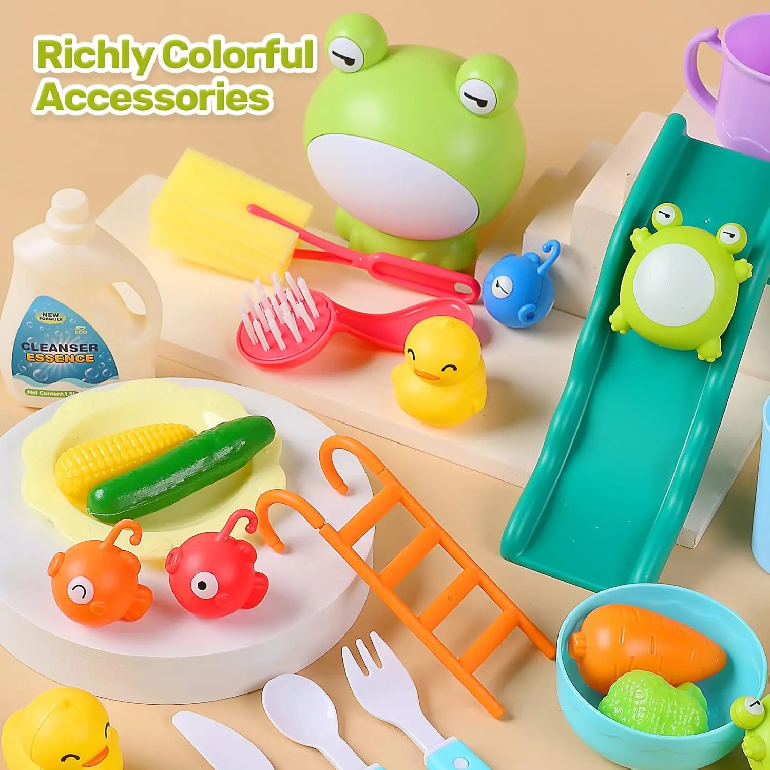 ·Included Items:1 x Plastic Cup1 x Plastic Plate1 x Brush1 x Play DetergentPlastic Knife and Fork SetVarious Play Food ItemsFloating Toy Fish and Frogs