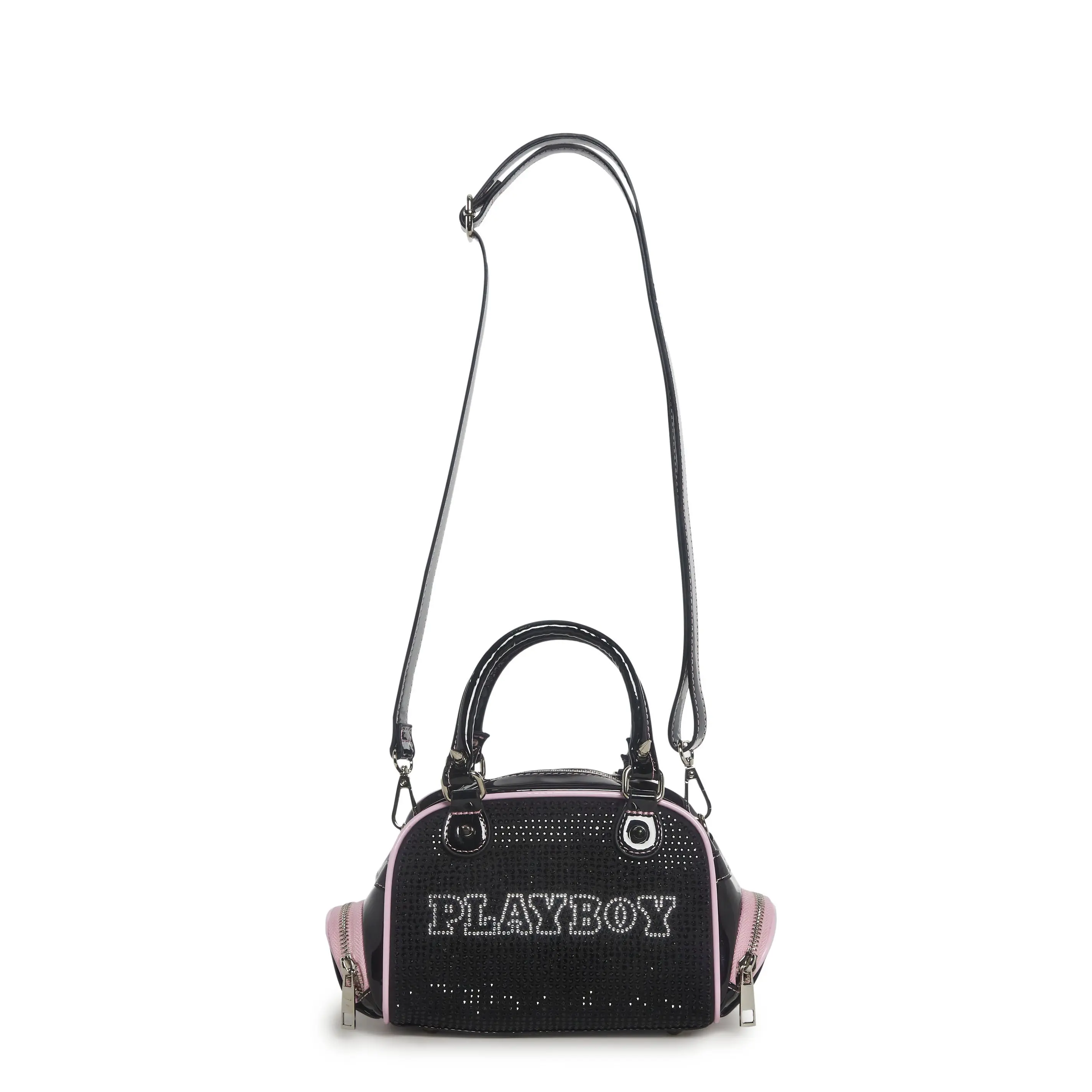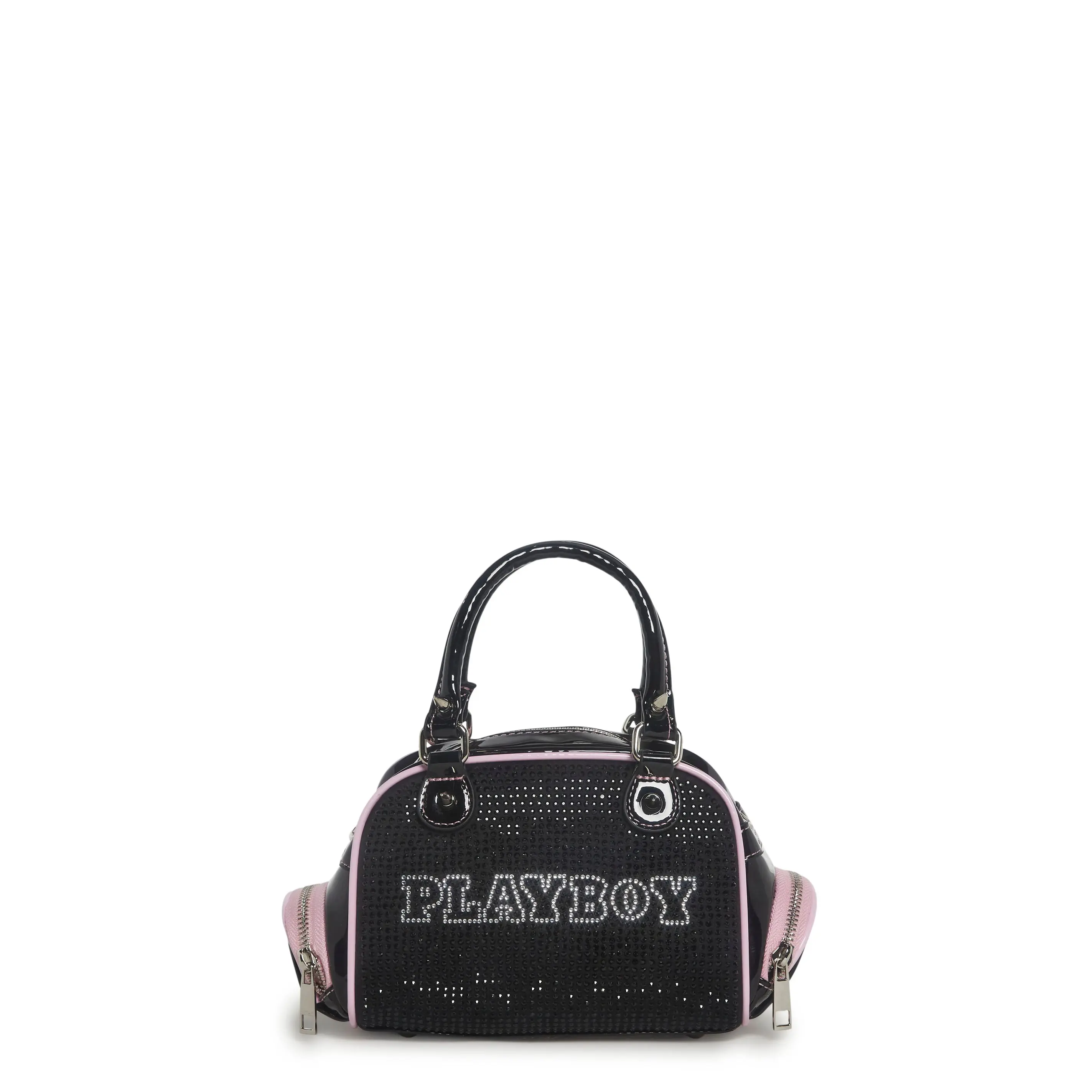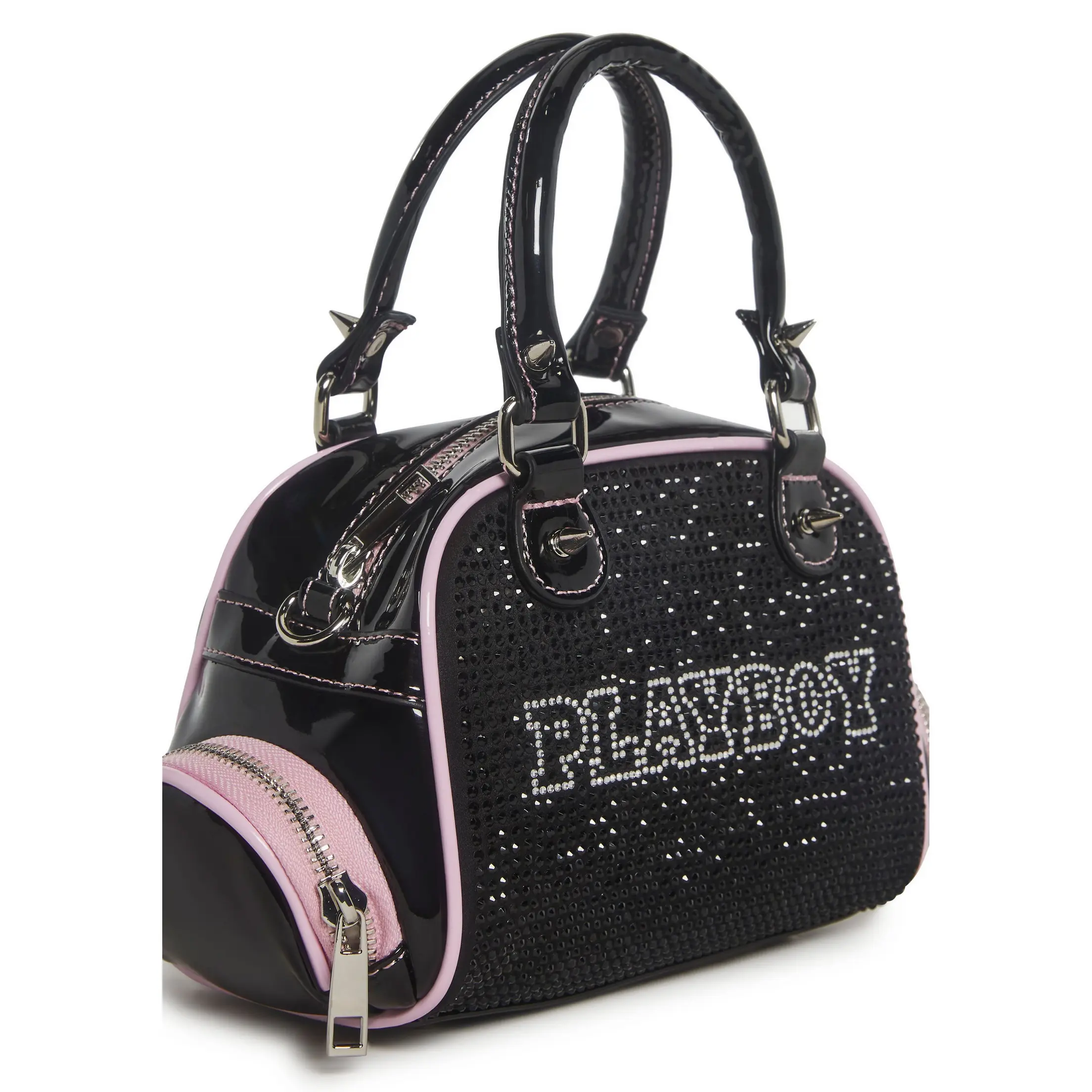This bag has a vinyl construction, rhinestone details, "Playboy" printed in rhinestones on the front, side zippered pockets, spiked accents on the top handles, a removable adjustable shoulder strap, and a top zipper closure.