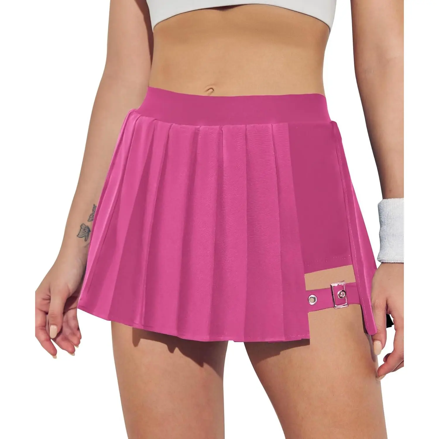 Women mini pleated skirts with inner shorts, high waisted, a-line, adjustable buckle, one pocket, y2k fashion clothes.