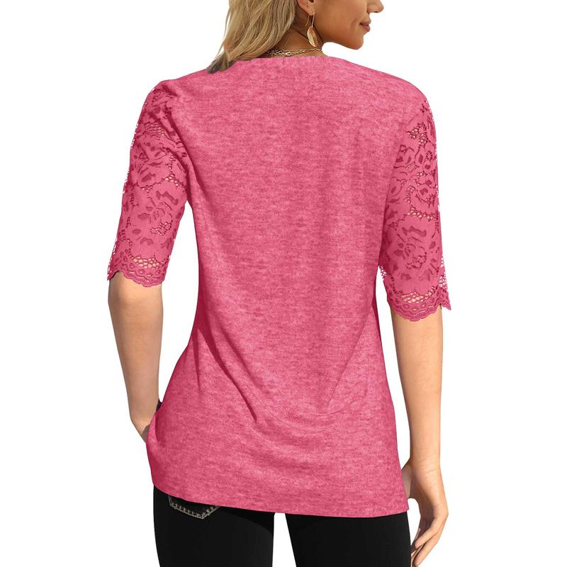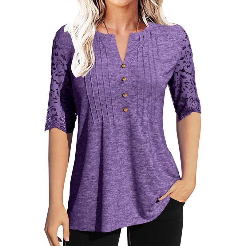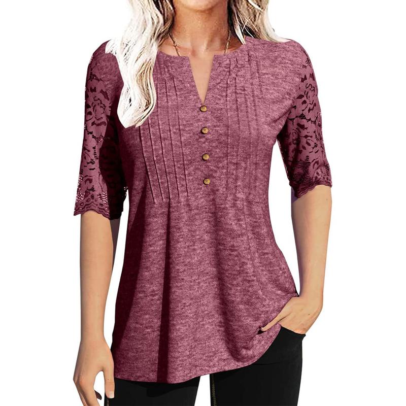 Danedvi Women's fashion summer pleated button lace half sleeve T-shirt V-neck solid color casual Tunic topDanedvi Women's fashion summer pleated button lace half sleeve T-shirt V-neck solid color casual Tunic top