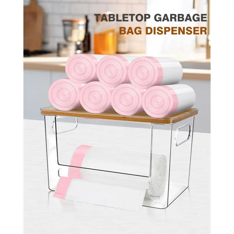 MATERIALS & DETAILS: The trash bag holder dispenser is made of material, transparent and simple, and elegant, it is a -have storage item for home decoration.Raised top edge prevents items from slipping out.Built-in handles on both sides for easy handling.non-slip mat for placement on countertops or under the sink