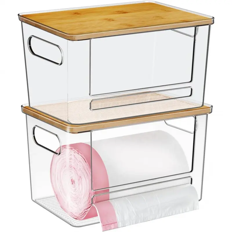 Material: Synthetic Feature: DurableUPGRADED DESIGN: The trash bag dispenser features the upgraded design with the addition of a crossbar design, so that trash bag rolls no longer follow out. Retain the wide front opening design for easy storage and access. The design makes it easier to reach garbage bags and more efficient for daily useCAPACITY: The garbage bag dispenser measures 11. 2*7. 5*7 inch, holds up to 110 garbage bags in 13 gallons, fits 13/30/33 gallon garbage bags in multiple sizes, which meets the needs of household storage and long-term useMATERIALS & DETAILS: The trash bag holder dispenser is made of material, transparent and simple, and elegant, it is a -have storage item for home decoration. Raised top edge prevents items from slipping out. Built-in handles on both sides for easy handling. non-slip mat for placement on countertops or under the sinkSTACKABLE TRASH BAG ORGANIZER: The trash bag organizer roll holder offers a top lid with a stackable design that maximizes vertical space and saves additional storage space, keep your trash bags organized with our garbage bag dispenser under sinkSUITABLE SCENARIO: The trash bag holder is for storing trash bags, potatoes, onions, snacks, organizing canned goods, coffee beans, baking supplies and other items, can be stored and organized under the sink, closet, countertop, kitchen, bathroom, laundry room, make your desktop or cabinet more neat and organized, have a neat and clean home space