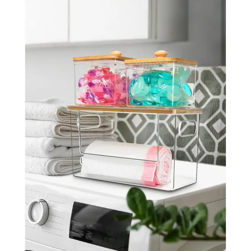 MATERIALS & DETAILS: The trash bag holder dispenser is made of material, transparent and simple, and elegant, it is a -have storage item for home decoration. Raised top edge prevents items from slipping out. Built-in handles on both sides for easy handling. non-slip mat for placement on countertops or under the sink