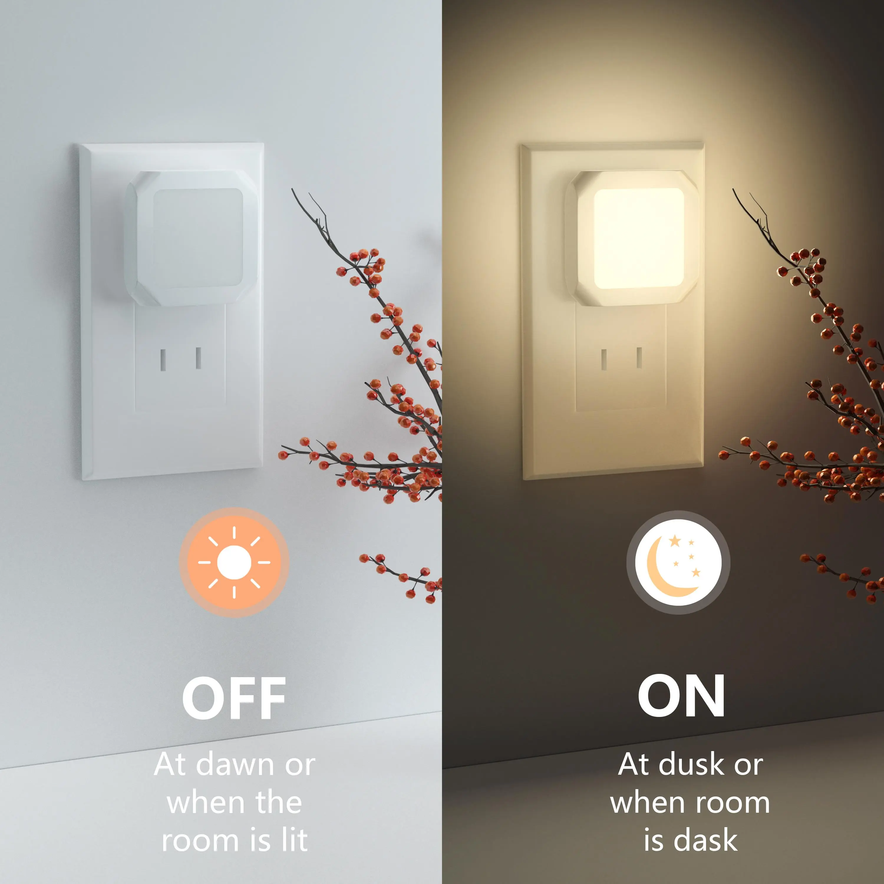 Automatic Lighting: With a smart dusk-to-dawn sensor, the night light automatically turns on at night or when ambient lighting becomes insufficient. It emits a soft light that is easy on your eyes, while still being bright enough to illuminate your path in the dark.