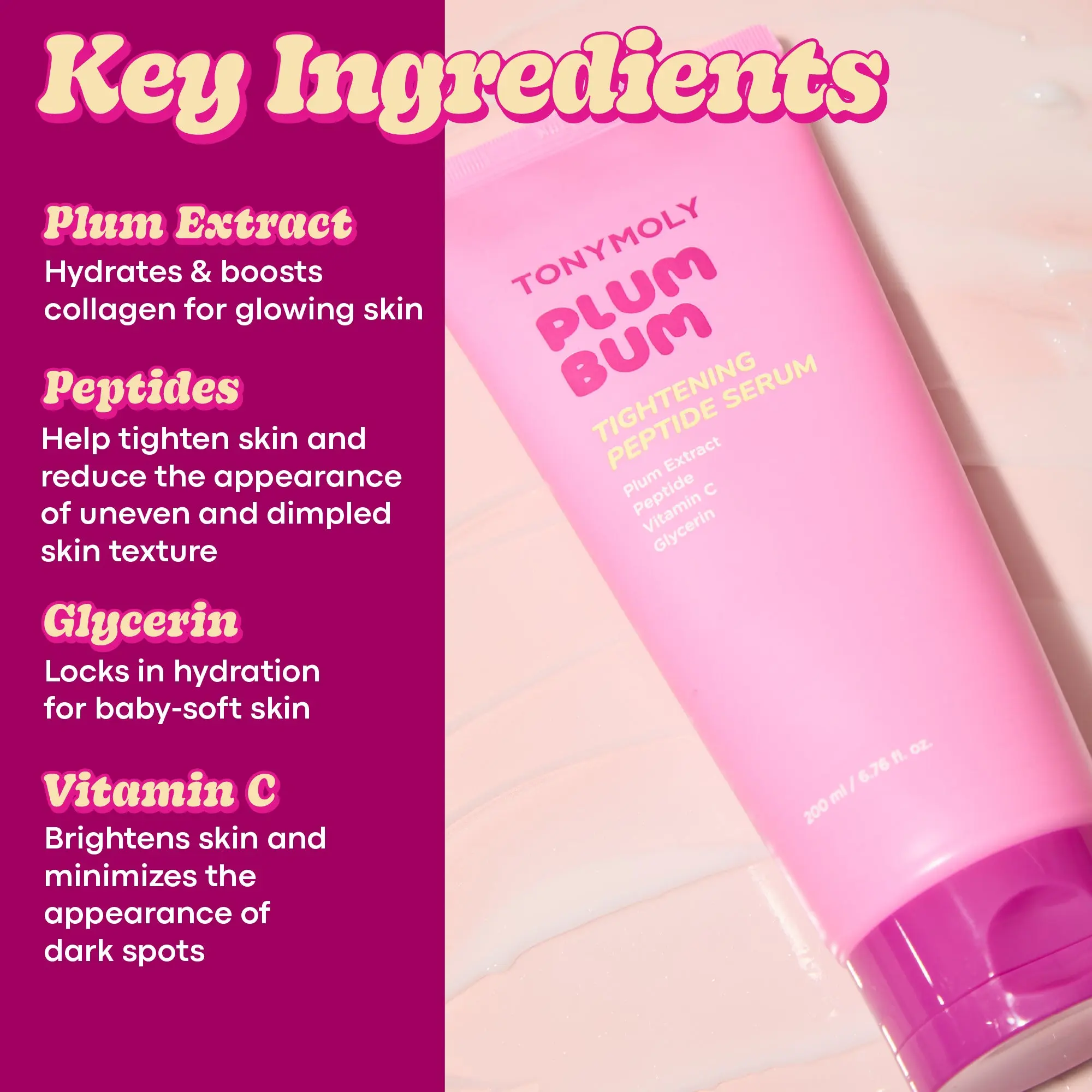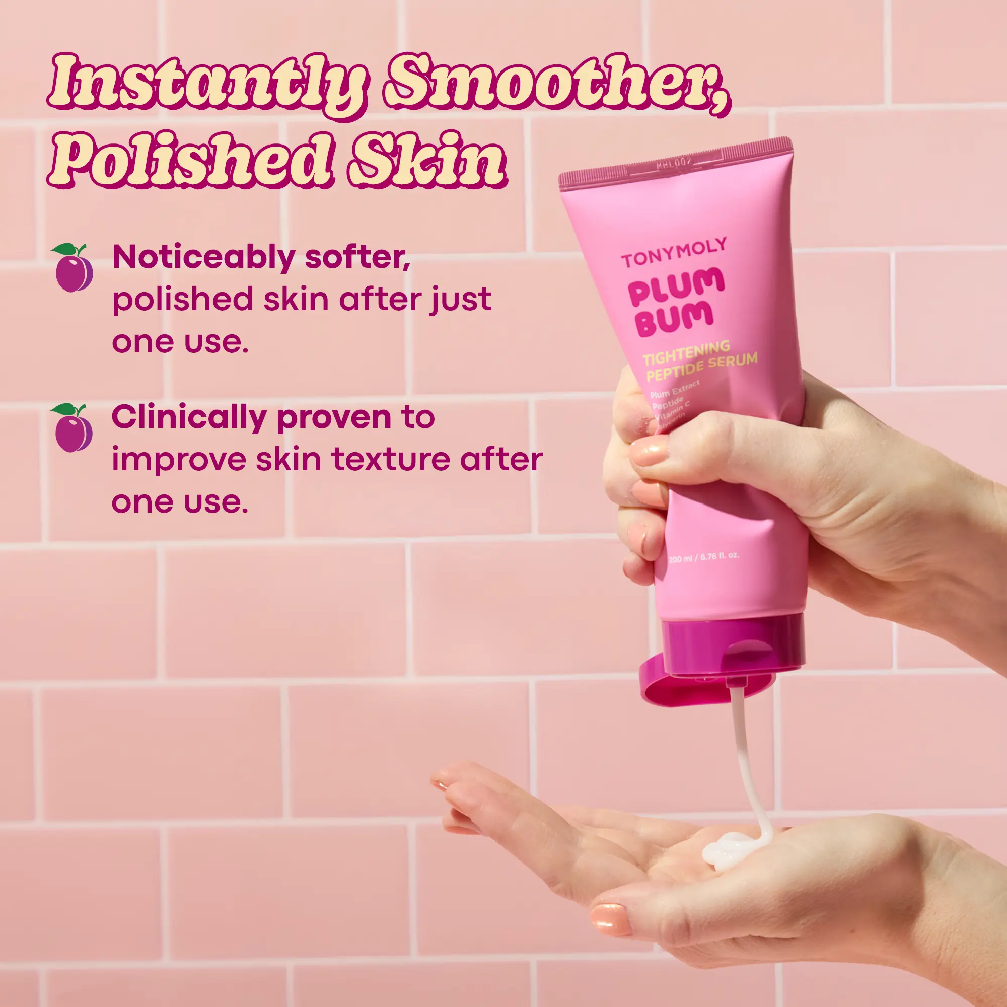 ยทPlum Bum Peptide Tightening Serum (200ml) - This serum locks in moisture and helps tighten skin, reducing signs of dimpled, uneven texture. Infused with Vitamin C to visibly brighten and reduce hyperpigmentation for that all-over radiant glow.