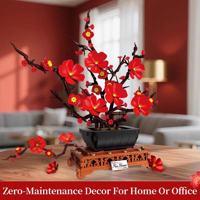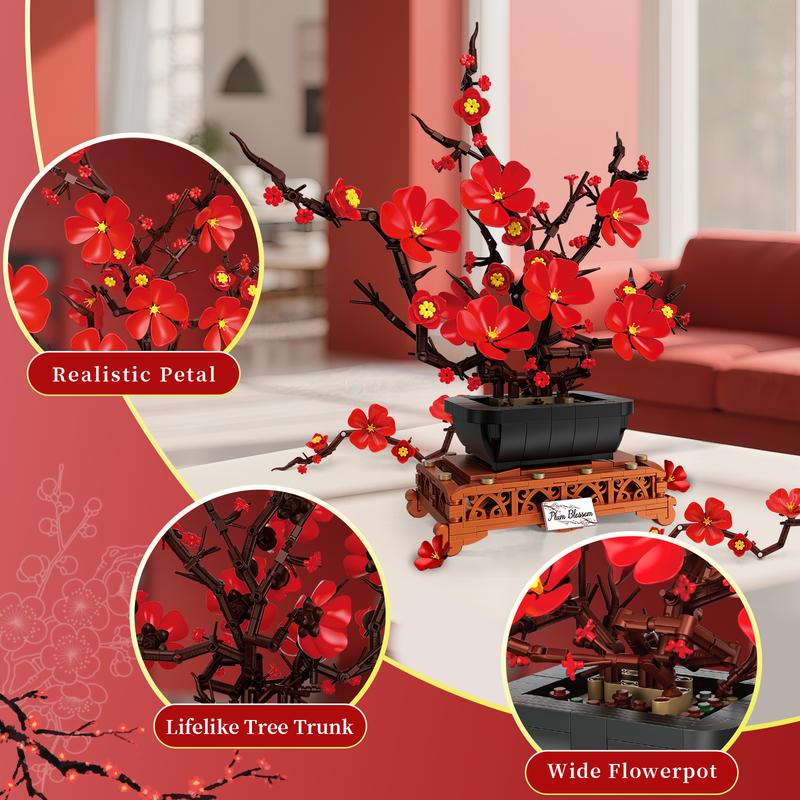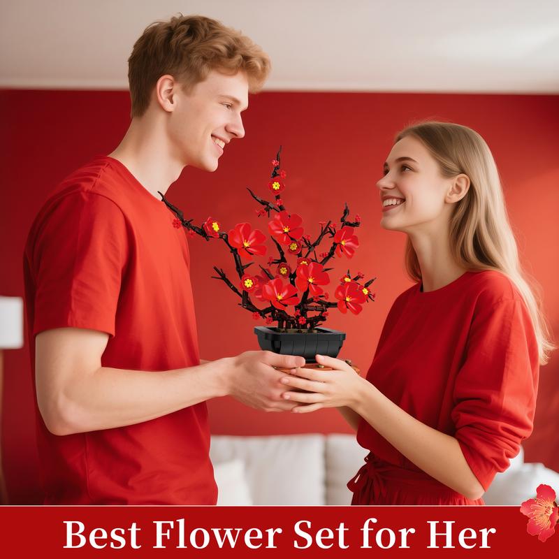 Plum Blossom Bonsai Building Set Valentine's Day gifts Flowers Botanical Collection for Adults Women Girls 14+ Living Room Home Office Decor Red,vdaygift