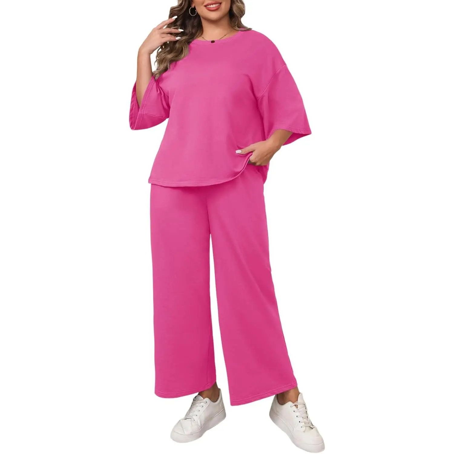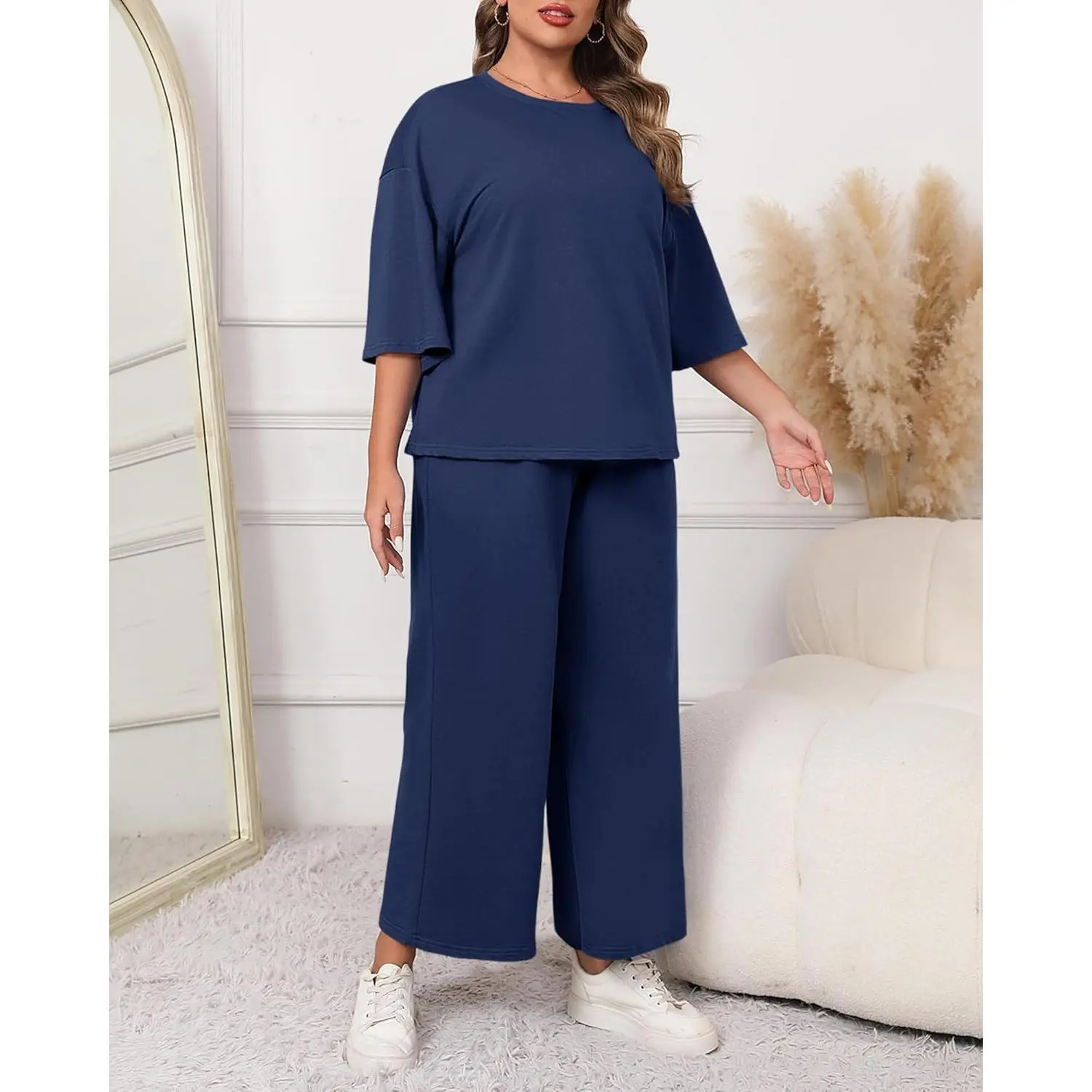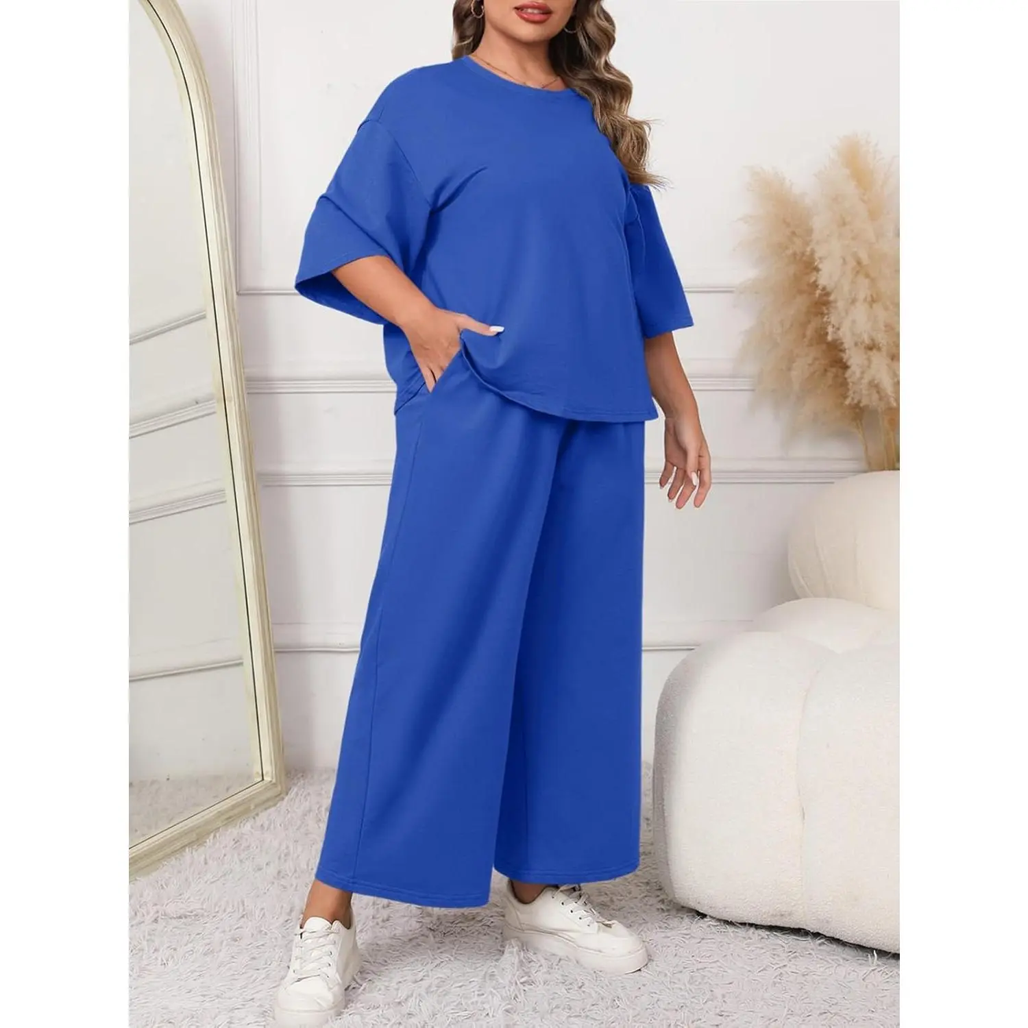 This outfit is cute and very comfortable. I wear it with some cute sneakers and get many compliments. I ordered it oversized for extra comfort.