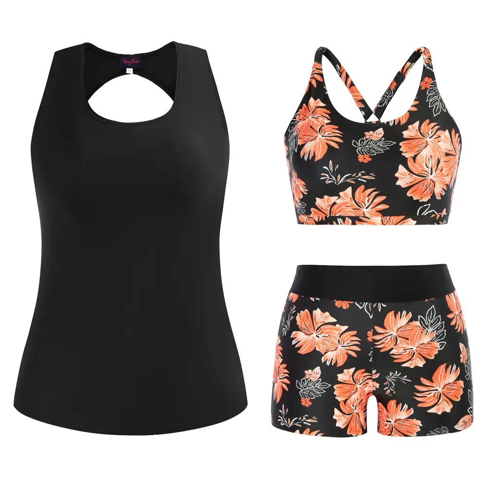 3 piece swimsuits for women include swim tank top + sports bra + boyshort.